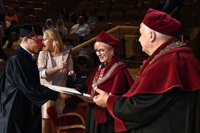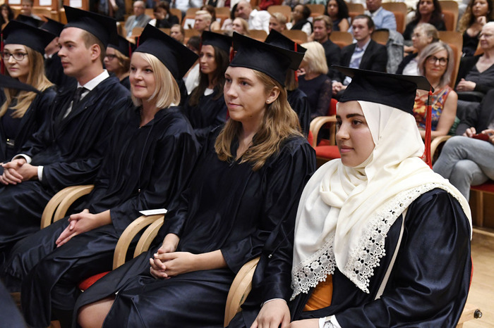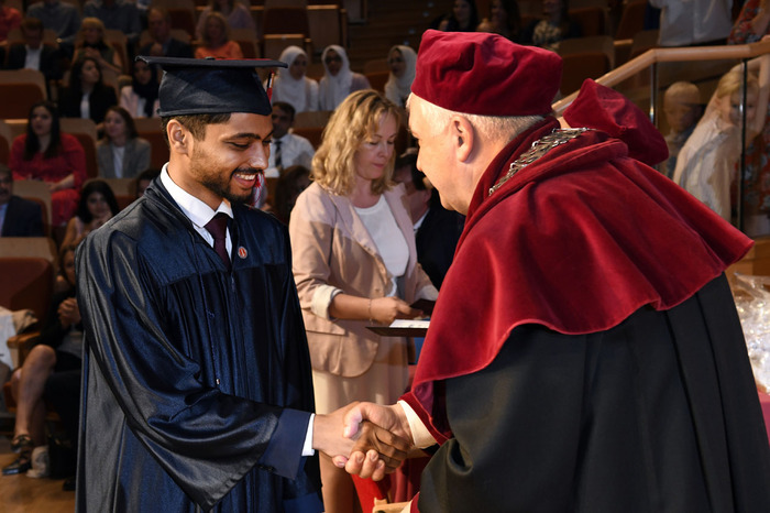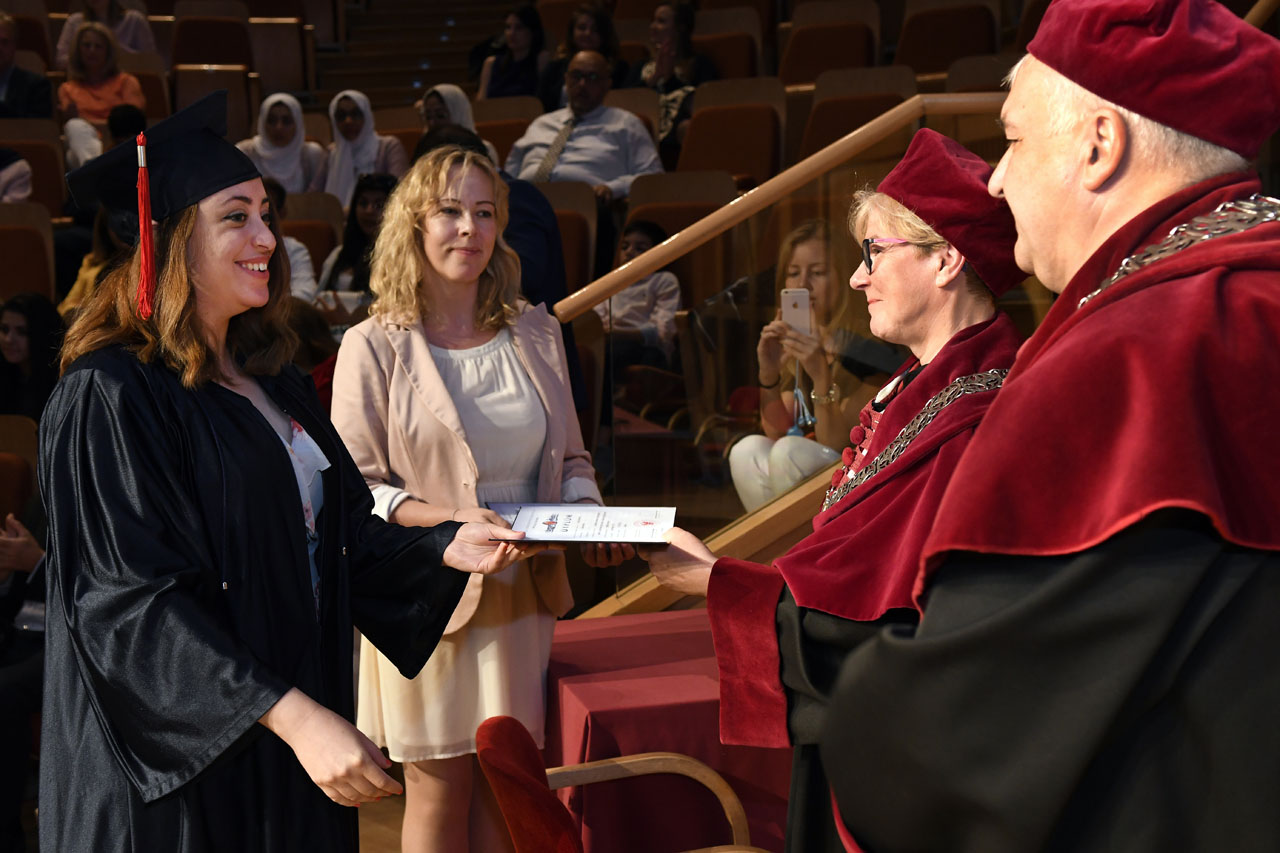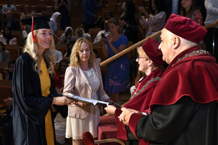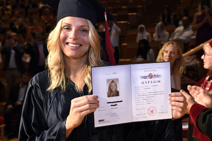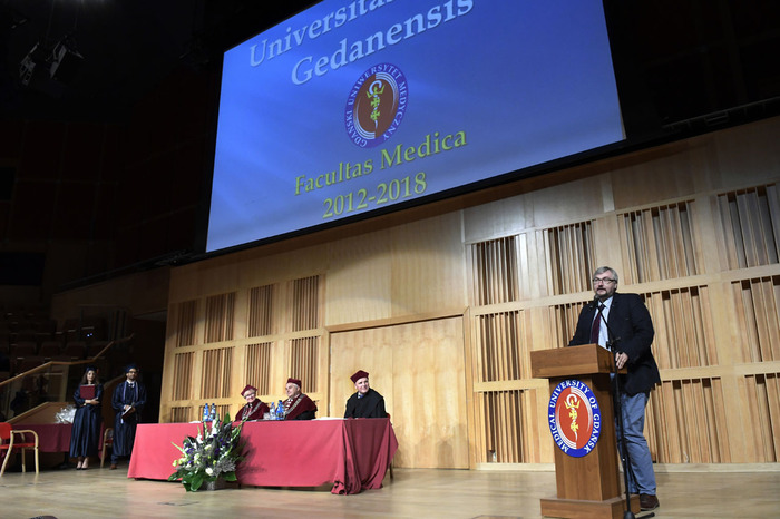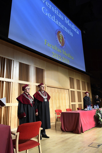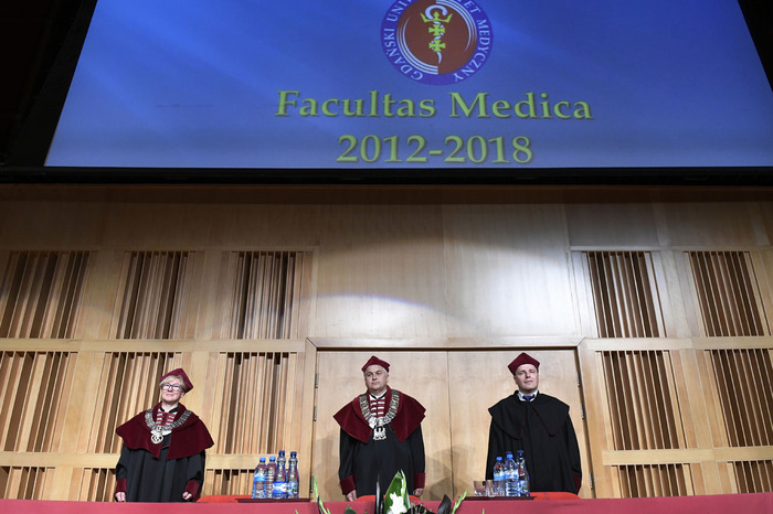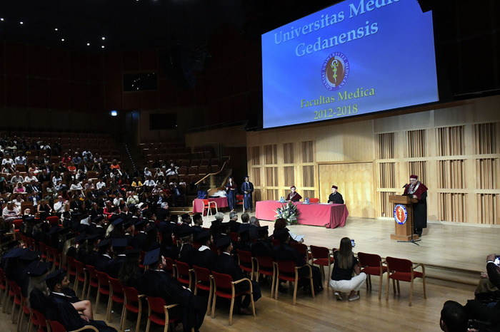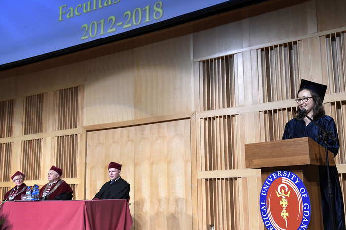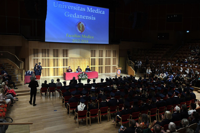 Siedemdziesięciu pięciu absolwentów Wydziału Lekarskiego kierunku lekarskiego anglojęzycznego rocznika 2012-2018 odebrało 30 czerwca br. swoje dyplomy z rąk prorektora ds. studenckich dr. hab. Tomasza Smiatacza oraz dziekan Wydziału Lekarskiego prof. Marii Dudziak. Dyplomatorium odbyło się w Polskiej Filharmonii Bałtyckiej im. Fryderyka Chopina. Przemówienia wygłosili m.in.: dr hab. Tomasz Smiatacz, prof. Maria Dudziak, prof. Michał Żmijewski – prodziekan Wydziału Lekarskiego, lek. dent. Ewa Siewierska-Chomeniuk – wiceprezes Okręgowej Rady Lekarskiej w Gdańsku, prof. Wiesław Makarewicz – wiceprezes Stowarzyszenia Absolwentów GUMed oraz Sarah Khalid, Marie Low i Walid Daabas – absolwenci rocznika 2012-2018. W imieniu studentów absolwentów pożegnała Lisa Karlsson, przedstawicielka studentów V roku English Division.