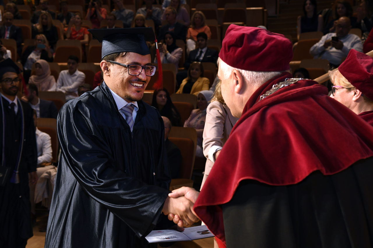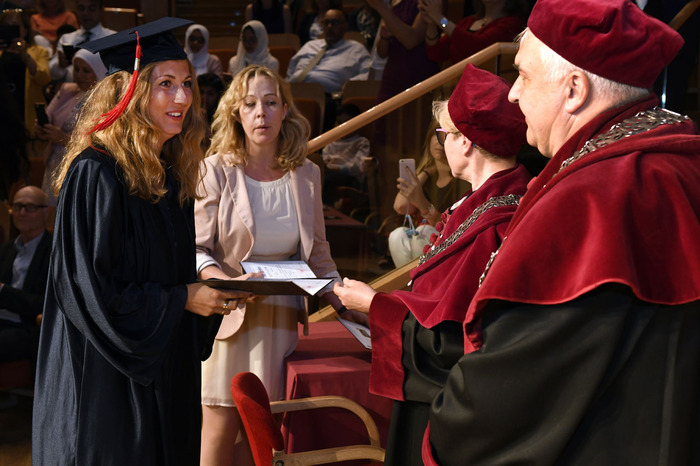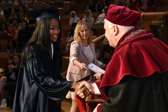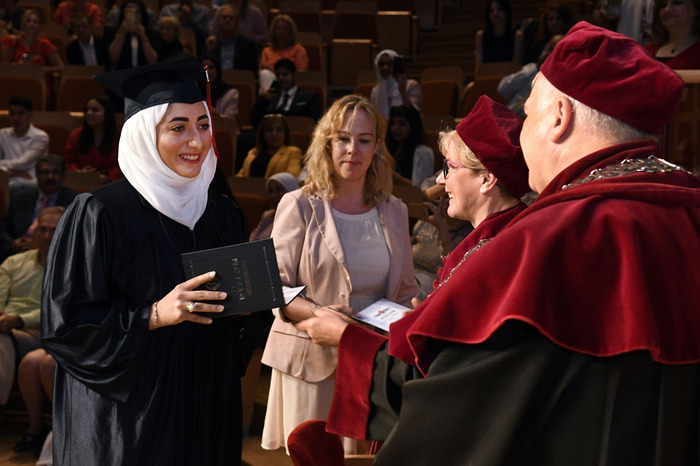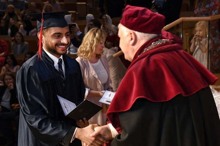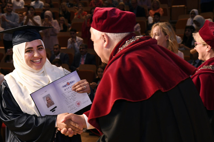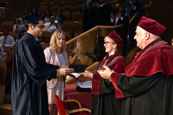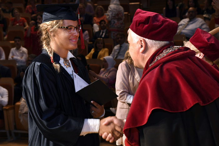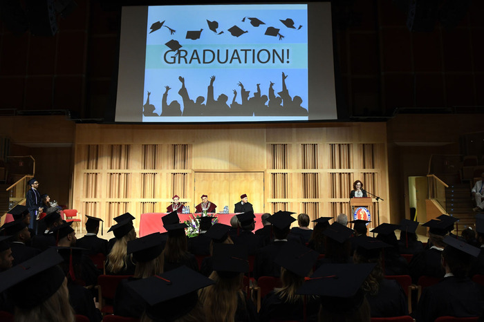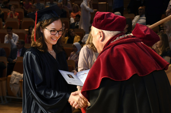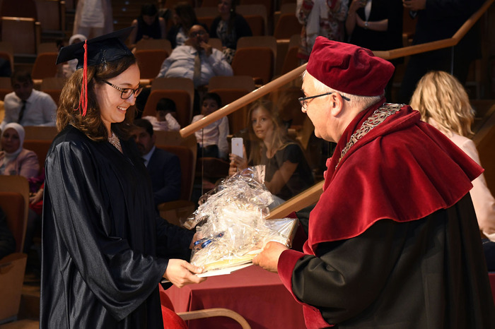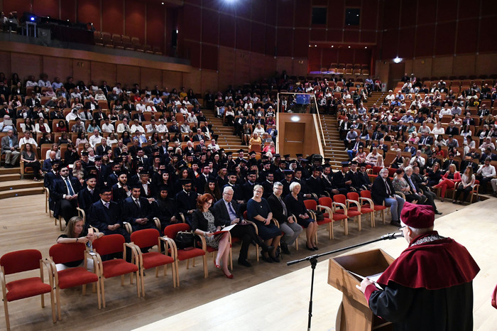 Siedemdziesięciu pięciu absolwentów Wydziału Lekarskiego kierunku lekarskiego anglojęzycznego rocznika 2012-2018 odebrało 30 czerwca br. swoje dyplomy z rąk prorektora ds. studenckich dr. hab. Tomasza Smiatacza oraz dziekan Wydziału Lekarskiego prof. Marii Dudziak. Dyplomatorium odbyło się w Polskiej Filharmonii Bałtyckiej im. Fryderyka Chopina. Przemówienia wygłosili m.in.: dr hab. Tomasz Smiatacz, prof. Maria Dudziak, prof. Michał Żmijewski – prodziekan Wydziału Lekarskiego, lek. dent. Ewa Siewierska-Chomeniuk – wiceprezes Okręgowej Rady Lekarskiej w Gdańsku, prof. Wiesław Makarewicz – wiceprezes Stowarzyszenia Absolwentów GUMed oraz Sarah Khalid, Marie Low i Walid Daabas – absolwenci rocznika 2012-2018. W imieniu studentów absolwentów pożegnała Lisa Karlsson, przedstawicielka studentów V roku English Division.