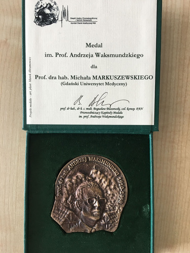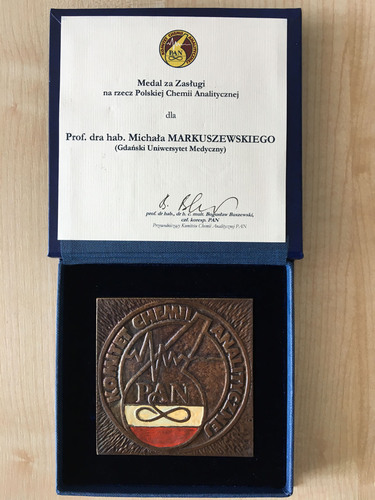 Prof. Michał Markuszewski został także wyróżniony Medalem za Zasługi na rzecz Polskiej Chemii Analitycznej przyznawanym przez Komitet Chemii Analitycznej PAN. Jest on wyrazem uznania za zasługi położone na rzecz popularyzacji chemii analitycznej, w tym organizację „24th International Symposium on Electro and Liquid Phase Separation Techniques” i „XI Polskiej Konferencji Chromatograficznej”, które odbyły się w Sopocie w 2017 r.