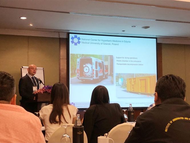 Dr hab. Jacek Kot, kierownik Krajowego Ośrodka Medycyny Hiperbarycznej GUMed uczestniczył jako zaproszony wykładowca w corocznej konferencji naukowej „Asian Hyperbaric and Diving Medicine Association (AHDMA)”. Odbyła się ona się w dniach od 26 do 28 lipca 2018 r. w Bangkoku i zgromadziła reprezentantów większości krajów tego rejonu z wyjątkiem Chin i Japonii, które mają swoje własne narodowe towarzystwa naukowe i nie uczestniczą we wspólnych międzynarodowych konferencjach.
