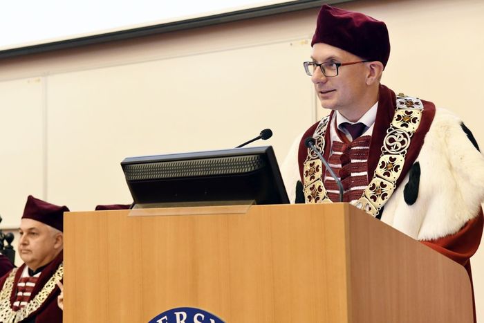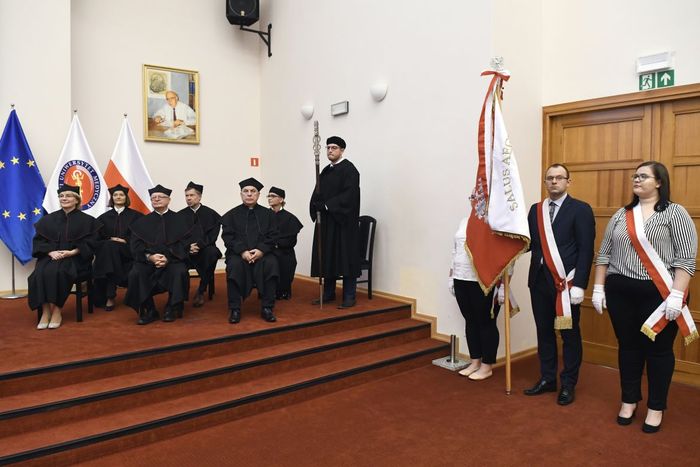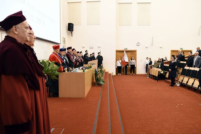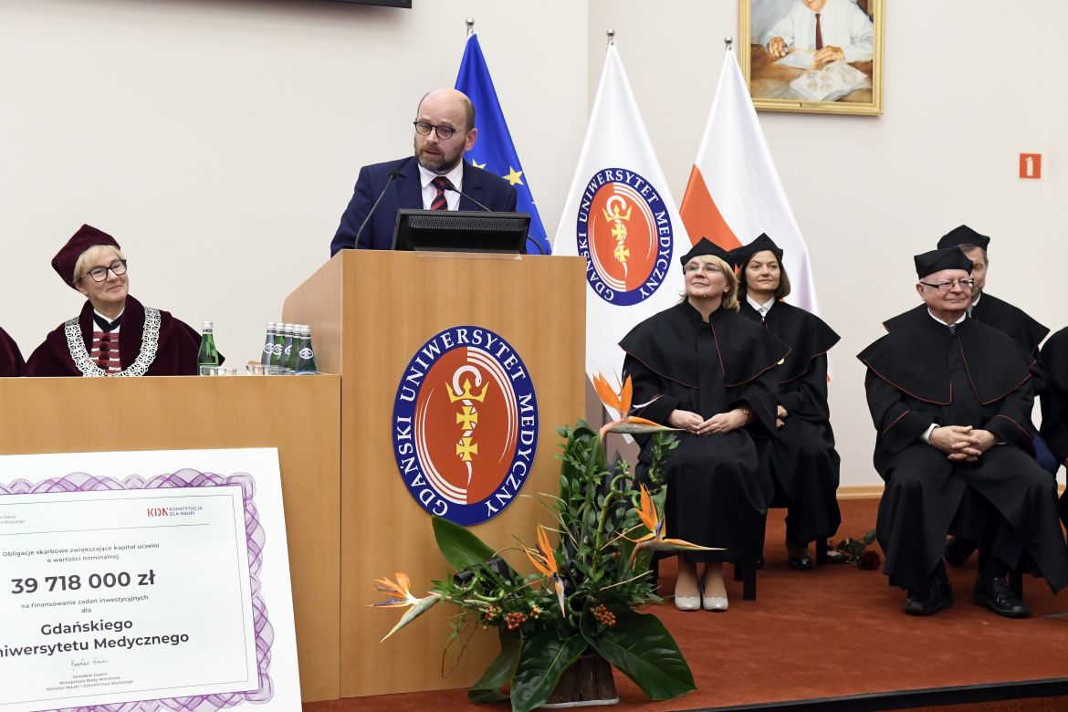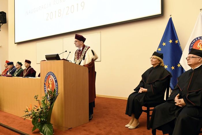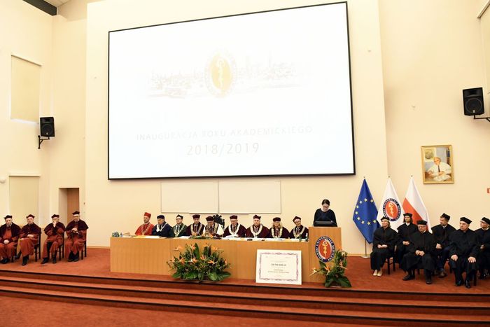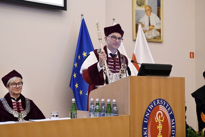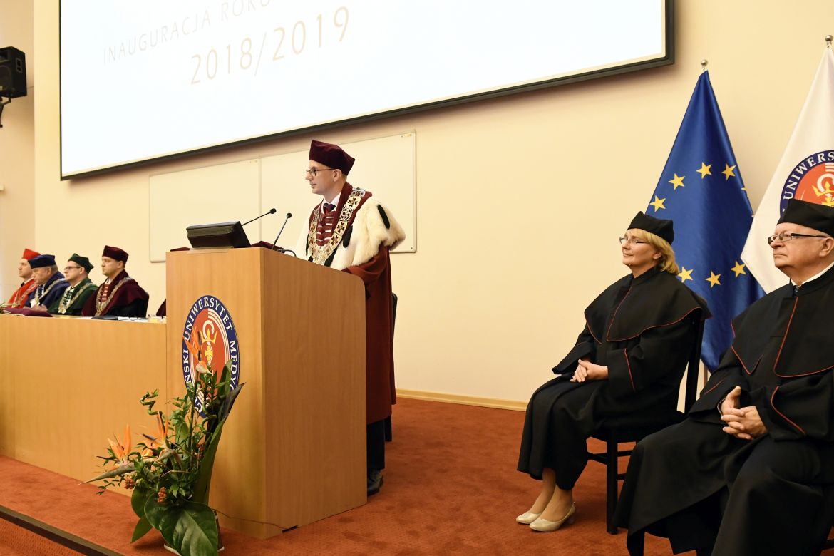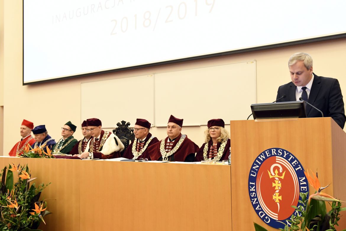 Rektor GUMed prof. Marcin Gruchała w swoim przemówieniu podkreślił, że przed Uczelnią rok pełen wyzwań związanych z wdrożeniem Konstytucji dla Nauki, która w sposób istotny zmienia dotychczasowe zasady organizacji i ustroju polskich uczelni. – Z całą stanowczością pragnę Państwa zapewnić, że dołożę wszelkich starań, aby projektowane zmiany, które w wielu aspektach istotnie odbiegają od dotychczasowych rozwiązań funkcjonujących w naszej Uczelni i mogą budzić niepokój środowiska, były wprowadzane w sposób transparentny, z zachowaniem tradycyjnej struktury wydziałowej GUMed i poszanowania kolegialnego trybu podejmowania decyzji – zapewniał rektor Gruchała.