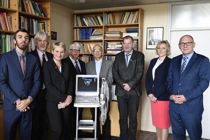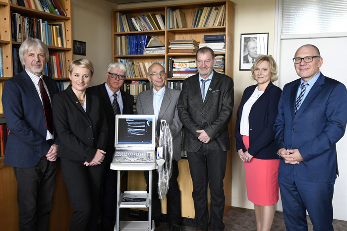 Nowoczesny ultrasonograf Mindray Z5 trafił do Katedry i Zakładu Fizyki i Biofizyki GUMed. Sprzęt został nieodpłatnie długotrwale wypożyczony przez chińską firmę Mindray Medical Poland za pośrednictwem polskiego dystrybutora firmy MAR-MED. W uroczystości, która odbyła się 24 października wzięli udział: prorektor ds. rozwoju i organizacji kształcenia Gdańskiego Uniwersytetu Medycznego prof. Jacek Bigda, prodziekan Wydziału Lekarskiego prof. Bartłomiej Ciesielski, prof. Wojciech Kosiak, który zorganizował przekazanie ultrasonografu dla Katedry, przedstawiciele firmy MAR-MED – Agnieszka Stepień i Adam Turno, menadżer ultrasonografii na Polskę firmy Mindray Marta Piwowarska, kierownik Katedry dr hab. inż. Piotr Boguś oraz zaproszeni goście. Ultrasonograf jest przeznaczony do dydaktyki dla studentów I roku Wydziału Lekarskiego oraz studentów innych kierunków studiów na GUMed i będzie wykorzystywany na ćwiczeniach studenckich na temat USG. Posiadając taki sprzęt, w ramach nauczania podstaw USG, czyli fizyki fal ultradźwiękowych, studenci będą mogli na zajęciach z biofizyki w Katedrze i Zakładzie Fizyki i Biofizyki zapoznać się i zrozumieć działanie najnowocześniejszej aparatury ultrasonograficznej.