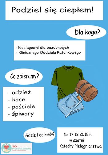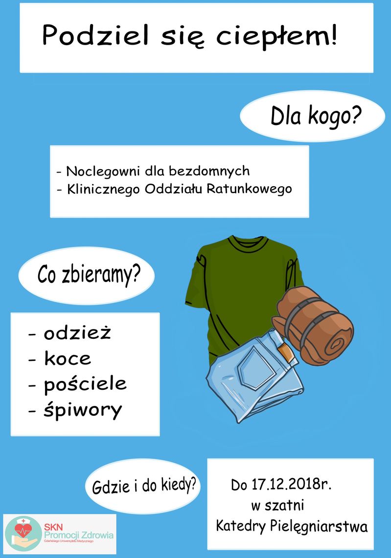 Aktywni są również studenci pielęgniarstwa zrzeszeni w SKN Promocji Zdrowia, którzy zbierają koce, pościele, śpiwory oraz odzież. Będą one przekazane Klinicznemu Oddziałowi Ratunkowemu, skąd trafią do bezdomnych pacjentów oraz noclegowni. Materiały można zostawiać w szatni Katedry Pielęgniarstwa (III piętro) do 17 grudnia br.
