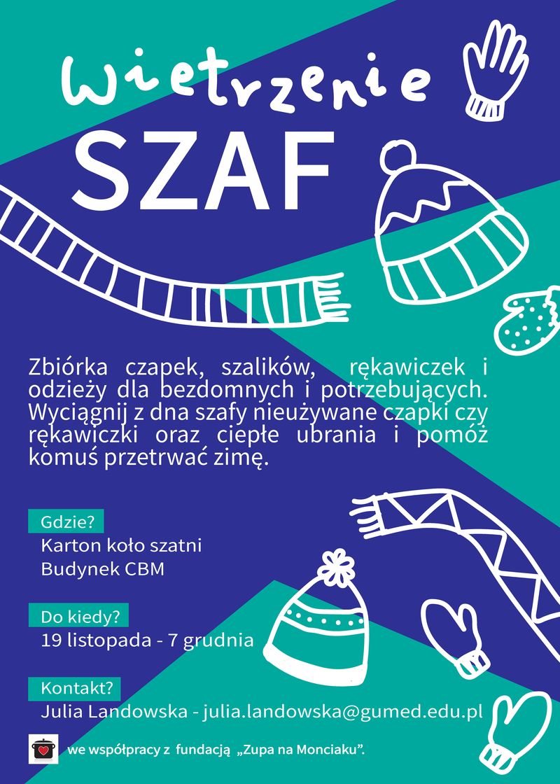 „Wietrzenie szaf” to inicjatywa Julii Landowskiej, studentki I roku Wydziału Lekarskiego i fundacji „Zupa na Monciaku”. Czapki, szaliki, rękawiczki i inne ciepłe ubrania można zostawiać w kartonie znajdującym się przy szatni w Collegium Biomedicum. Zbiórka trwa do 7 grudnia br.