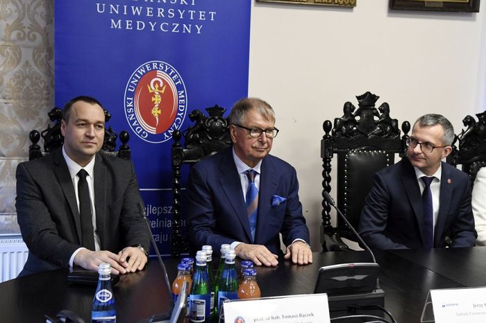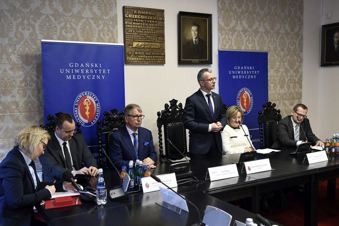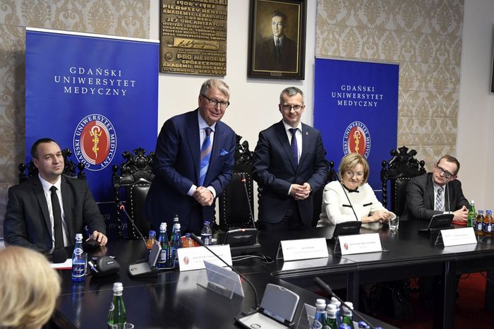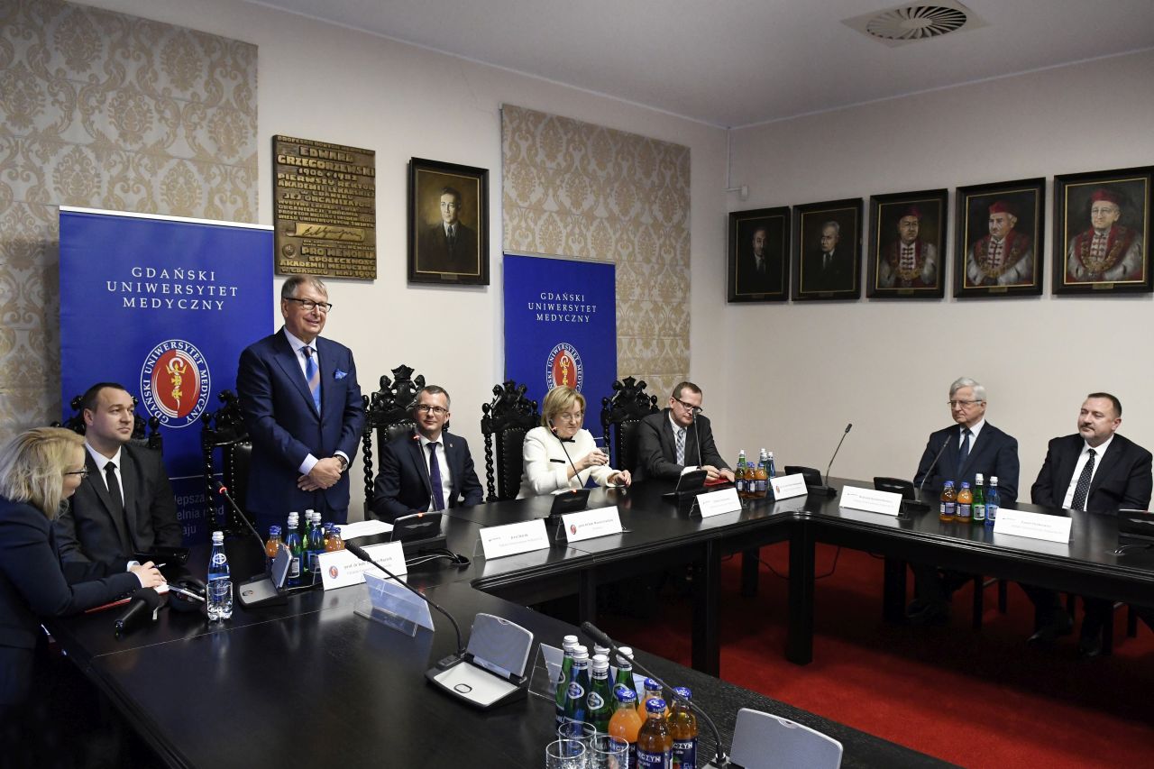Dziekan Wydziału Farmaceutycznego z OML przybliżył zgromadzonym sylwetkę Laureata Medalu „Zasłużonemu AMG”, jego bogate doświadczenie zawodowe oraz osobiste zaangażowanie we wspieraniu polskiej nauki i młodych zdolnych naukowców. Dziekan Markuszewski przypomniał również o uruchomionych w 2017 r. unikatowych studiach o profilu praktycznym na kierunku przemysł farmaceutyczny i kosmetyczny, realizowanych przez GUMed i Polpharmę. Po uroczystym wręczeniu Medalu przez Rektora i wystąpieniu prezesa Staraka, prof. Tomasz Bączek – prorektor ds. nauki przedstawił zgromadzonym prezentację o Uczelni, jej główne osiągnięcia w zakresie prac naukowych, badawczych i rozwojowych, akcentując ostatnie sukcesy, w tym m.in. bardzo dobrą pozycję w rankingu przygotowanym przez Fundację Edukacyjną Perspektywy, jak również zdobycie po raz drugi nagrody ELSEVIER Research Impact Leaders Award 2018 w obszarze nauk o zdrowiu i medycznych. Podczas wizyty w naszej Uczelni goście odwiedzili również nowoczesny kompleks kliniczny GUMed położny przy ul. Smoluchowskiego 17 – budynek Centrum Medycyny Inwazyjnej wraz z Klinicznym Oddziałem Ratunkowym.