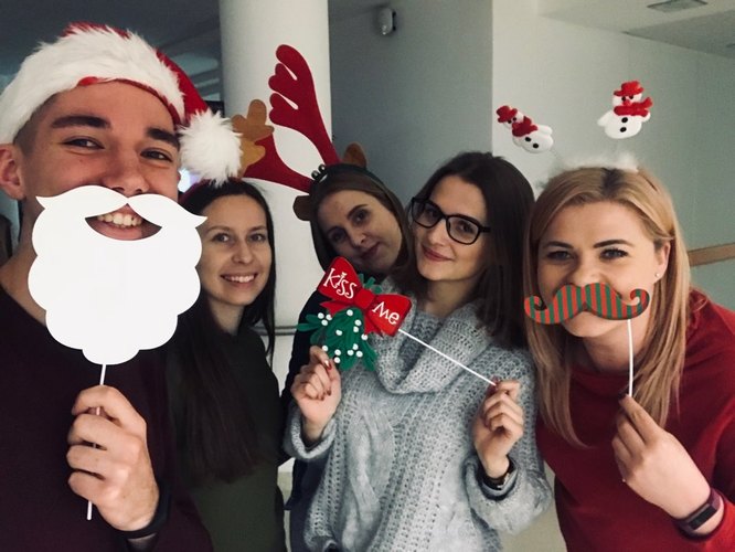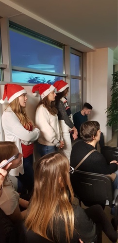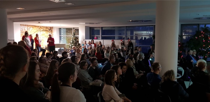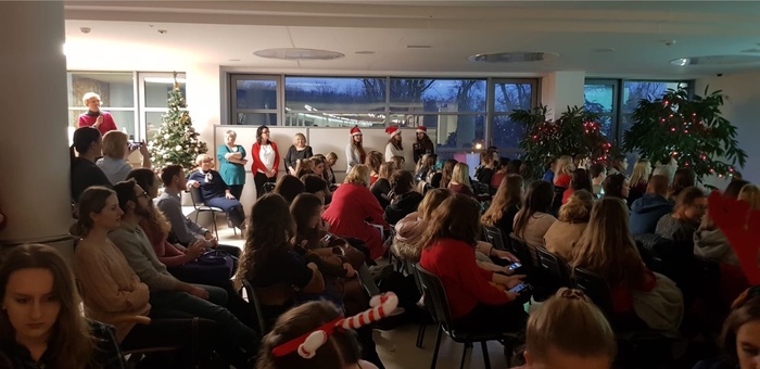 Wspólne śpiewanie angielskich kolęd i amerykańskich piosenek świątecznych – tak w skrócie wyglądało środowe popołudnie 12 grudnia br. w Centrum Medycyny Inwazyjnej. Spotkanie zorganizowało Studium Praktycznej Nauki Języków Obcych. Kolędowanie było naprawdę wspólne – na scenie na II piętrze CMI, dookoła białego fortepianu, przy którym tradycyjnie już zasiadł Adam Niedorezo, zebrali się byli i aktualni studenci GUMed – mgr Sławka Misiewicz, Dominika Okumska, Joanna Regner i Joanna Dąbrowska z pielęgniarstwa, Dominika Marzec (wspomagająca gitarą) i Tomasz Zalewski (czuwający nad techniką) z II roku ratownictwa medycznego oraz Małgorzata Szwaj, wiceprezes English Unlimited. Wśród zaproszonych gości była prof. Maria Dudziak, dziekan Wydziału Lekarskiego, która zaskoczyła słuchaczy grając pięknie na fortepianie “Bóg się rodzi” i “Cichą noc”, a studenci, jak przystało na Studium Języków Obcych zaśpiewali ją po angielsku, niemiecku, hiszpańsku i polsku. Nie zabrakło też kolędy po francusku, którą wykonała Anna Jachymek z II roku kierunku lekarskiego i łacinie.