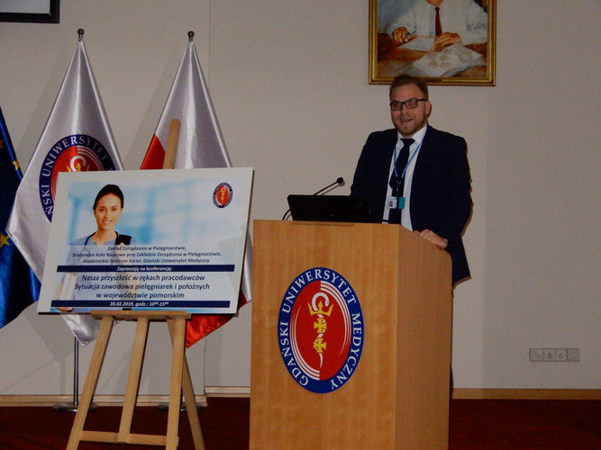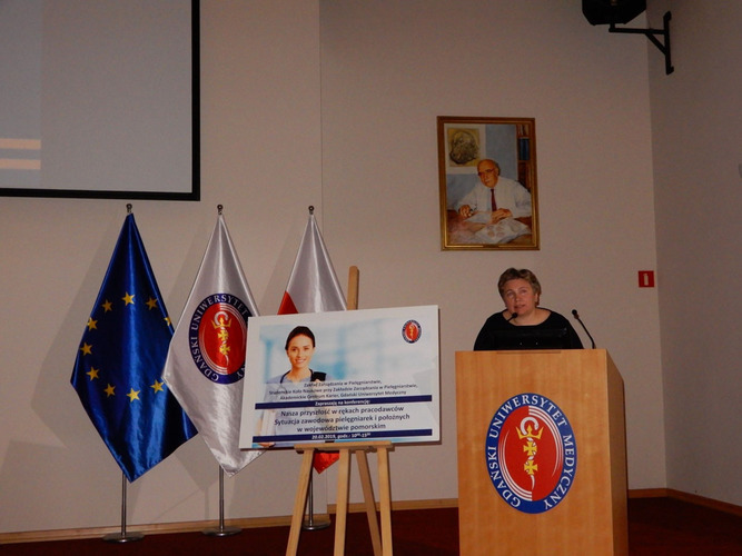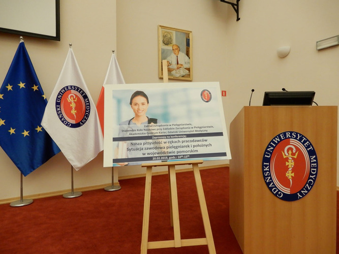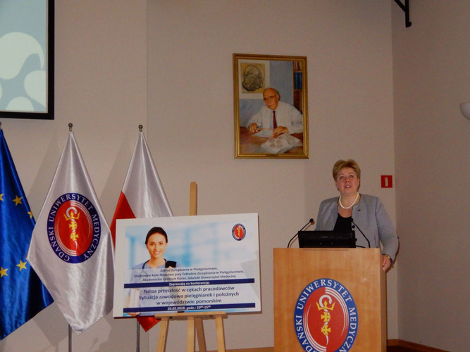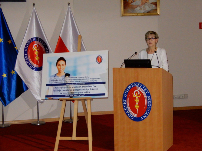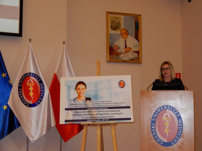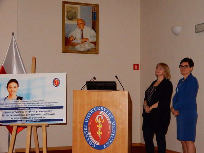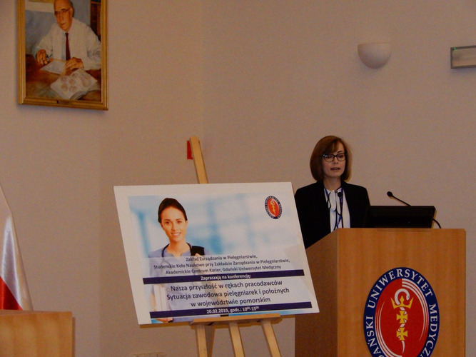 Konferencja „Nasza przyszłość w rękach pracodawców – sytuacja zawodowa pielęgniarek i położnych w województwie pomorskim” zorganizowana przez Zakład Zarządzania w Pielęgniarstwie, Studenckie Koło Naukowe przy Zakładzie Zarządzania w Pielęgniarstwie oraz Akademickie Centrum Karier odbyła się 20 lutego 2019 r. w Auditorium Primum im. prof. Olgierda Narkiewicza AGN. Otworzyła ją dr hab. Aleksandra Gaworska-Krzemińska, prodziekan Wydziału Nauk o Zdrowiu. Przewodnicząca Okręgowej Izby Pielęgniarek i Położnych w Gdańsku mgr Anna Czarnecka w wystąpieniu „Problemy na rynku pracy” podjęła tematy związane ze wskaźnikami zatrudnienia pielęgniarek i położnych, strukturą wiekową, systemem podnoszenia płac, a także problemem negatywnego kreowania wizerunku pielęgniarek w mediach i opinii społecznej. Mgr Anna Zaremba-Duszota, rzecznik odpowiedzialności zawodowej pielęgniarek i położnych ORPIP w Gdańsku zaprezentowała zasady bezpiecznego wykonywania zawodów pielęgniarki i położnej.