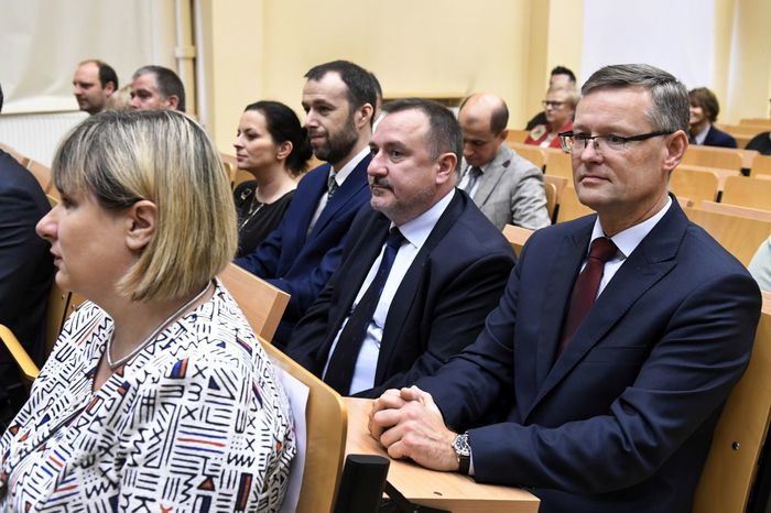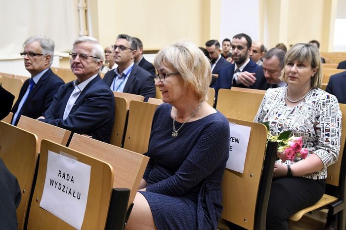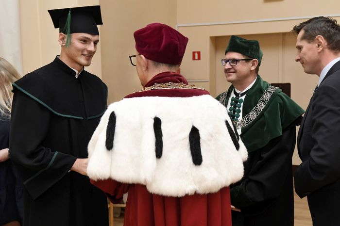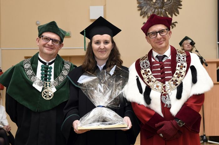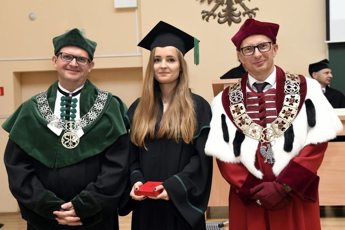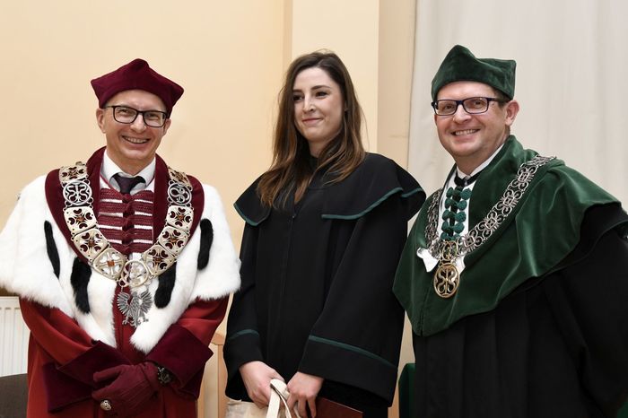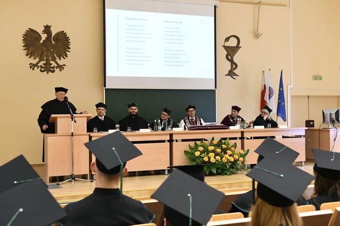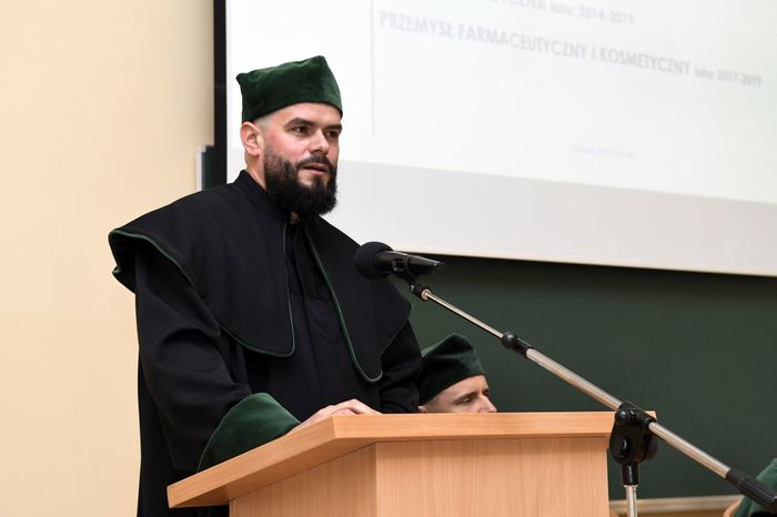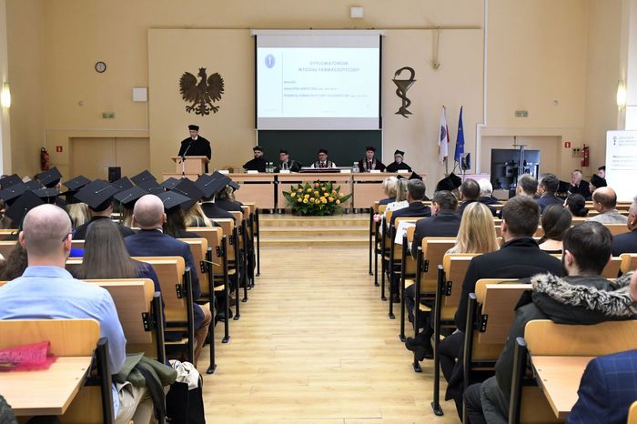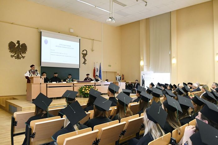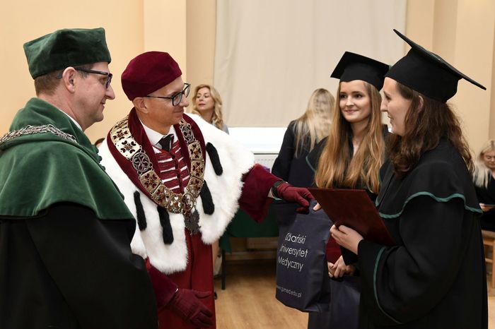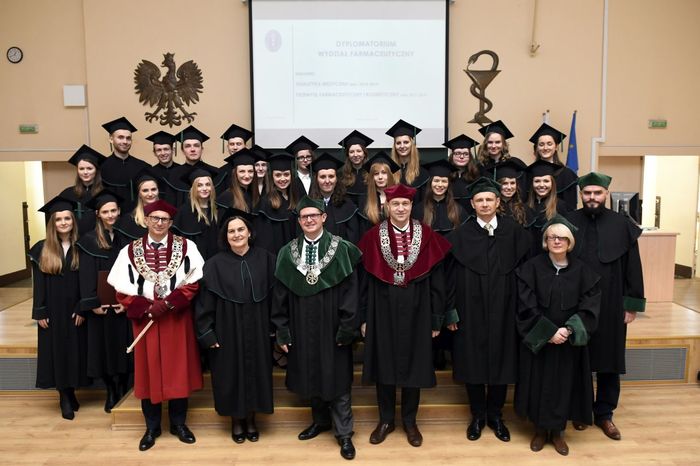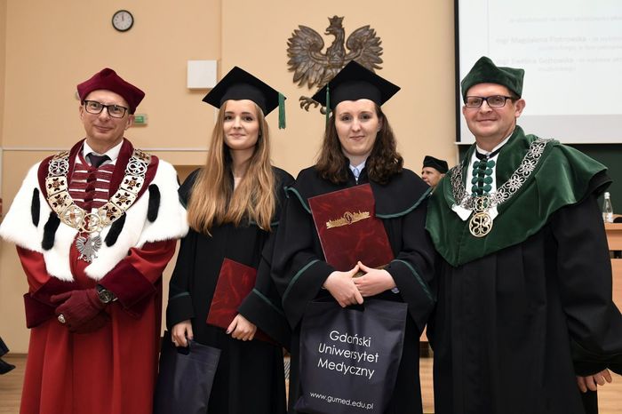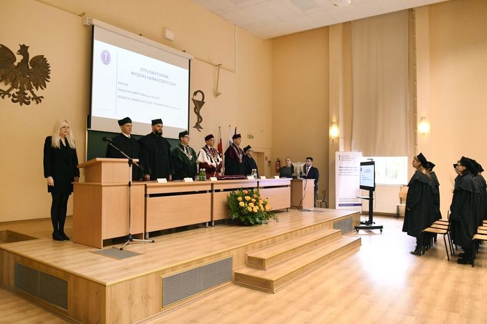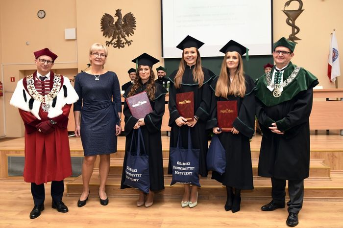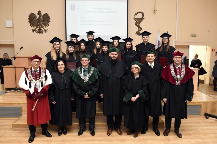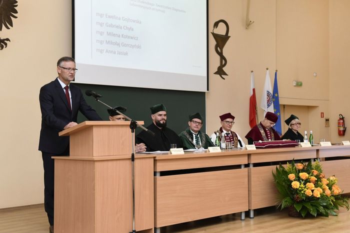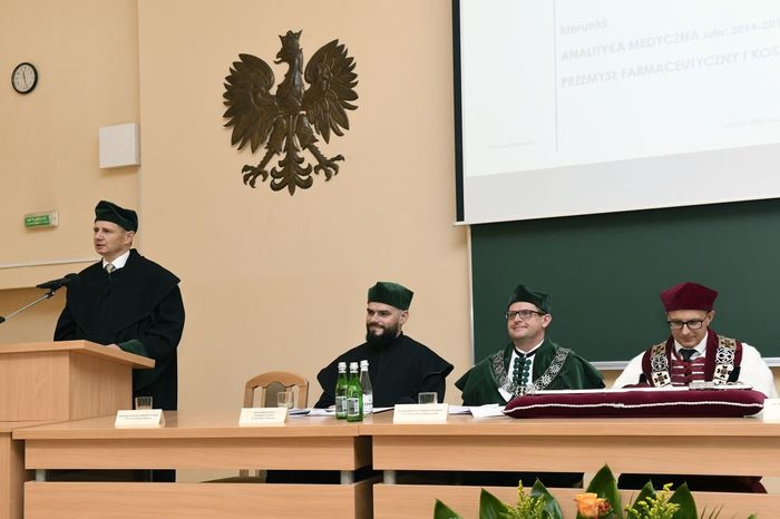 W uroczystości uczestniczyli: prof. Marcin Gruchała – rektor GUMed, prof. Tomasz Bączek – prorektor ds. nauki, prof. Michał Markuszewski – dziekan Wydziału Farmaceutycznego, prof. Maciej Jankowski – kierownik kierunku analityka medyczna, dr hab. Bartosz Wielgomas – kierownik kierunku przemysł farmaceutyczny i kosmetyczny, dr hab. Anita Kornicka – prodziekan Wydziału Farmaceutycznego.