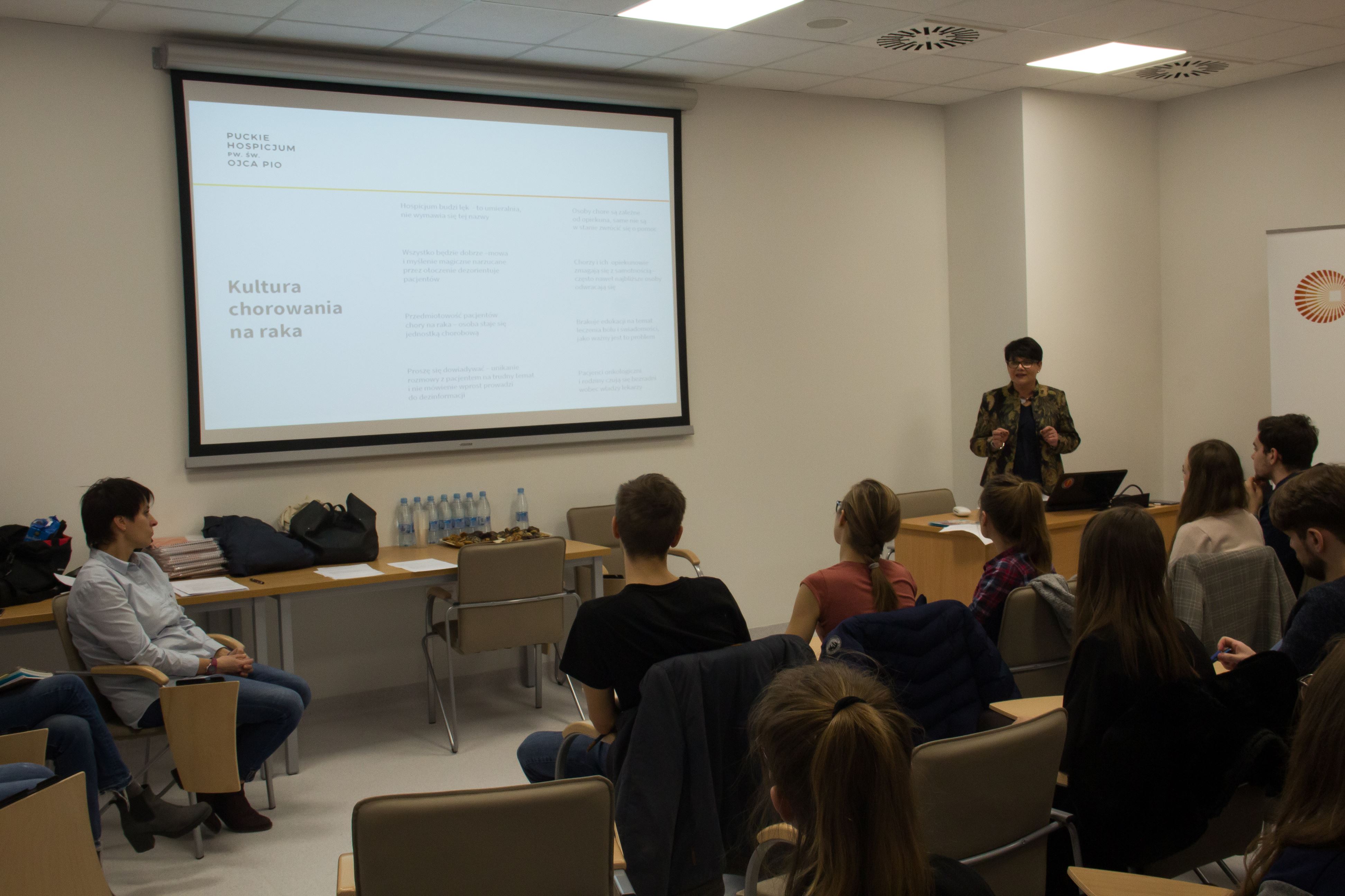 Uczestnicy mieli możliwość wysłuchania wykładu eksperta z zakresu medycyny paliatywnej – dr Doroty Olszewskiej, kierownika medycznego Hospicjum, a także poprawy swoich praktycznych umiejętności komunikacyjnych podczas dwugodzinnych warsztatów z udziałem profesjonalnych aktorów. Warsztaty złożone były z krótkich scenek, podczas których pod okiem psychoonkologów Puckiego Hospicjum studenci wcielali się w role lekarzy, a aktorzy w role pacjentów.