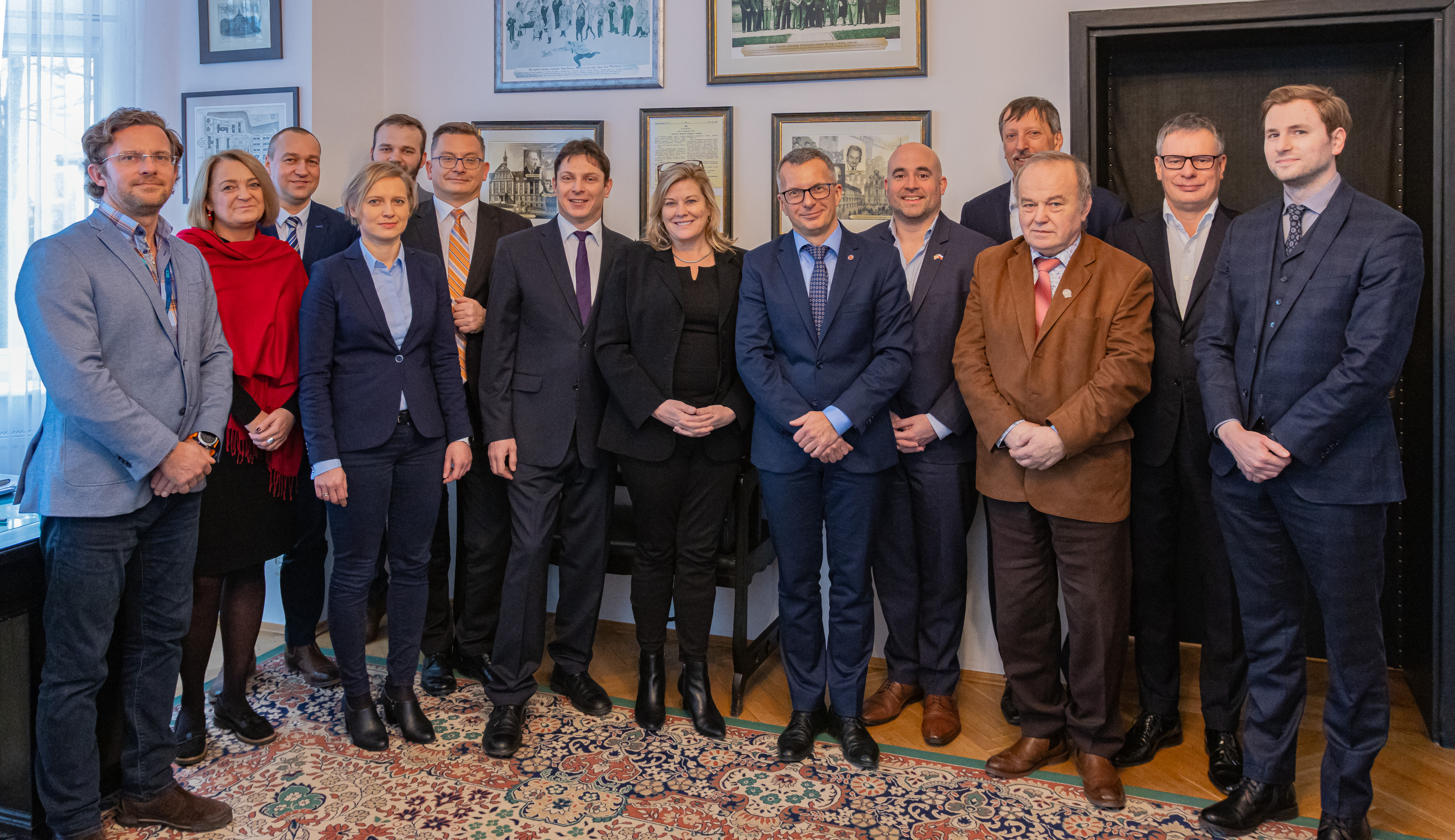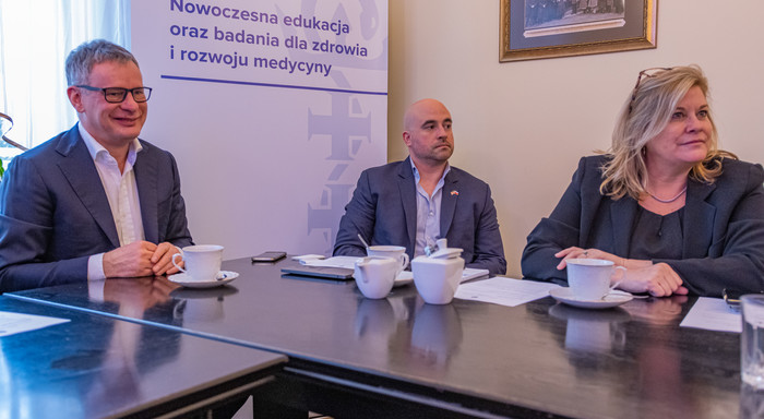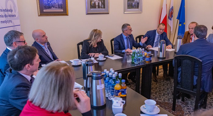 Melina Davis, dyrektor naczelna Medical Society of Virginia, José Morey, M.D., dyrektor ds. innowacji medycznych w Liberty BioSecurity, Elizabeth Frank, dyrektor wykonawcza OneDigital, dr Michael Czekajlo, lekarz naczelny ds. nagłych przypadków w Hunter Holmes McGuire VA Medical Center i VCU Health System i Marcin Hańczaruk, współprzewodniczący Fundacji Polsko-Amerykańskiej AFI Polska odwiedzili Gdański Uniwersytet Medyczny. 24 stycznia br. spotkali się z prof. Marcinem Gruchałą, rektorem GUMed, dyrektorem ds. lecznictwa UCK Tomaszem Stefaniakiem, prof. Tomaszem Bączkiem, prorektorem ds. nauki oraz prof. Andrzejem Basińskim, dziekanem Wydziału Nauk o Zdrowiu. Obecni byli również dr Krzysztof Basiński, pełnomocnik Rektora ds. międzynarodowej wymiany studentów i współpracy naukowej w dziedzinie psychologii zdrowia, dr Krzysztof Chlebus z I Katedry i Kliniki Kardiologii, dr Katarzyna Waligóra-Borek, p.o. dyrektora Centrum Transferu Technologii i dr hab. Magdalena Błażek, p.o. kierownika Zakładu Badań nad Jakością Życia i Katedry Psychologii.