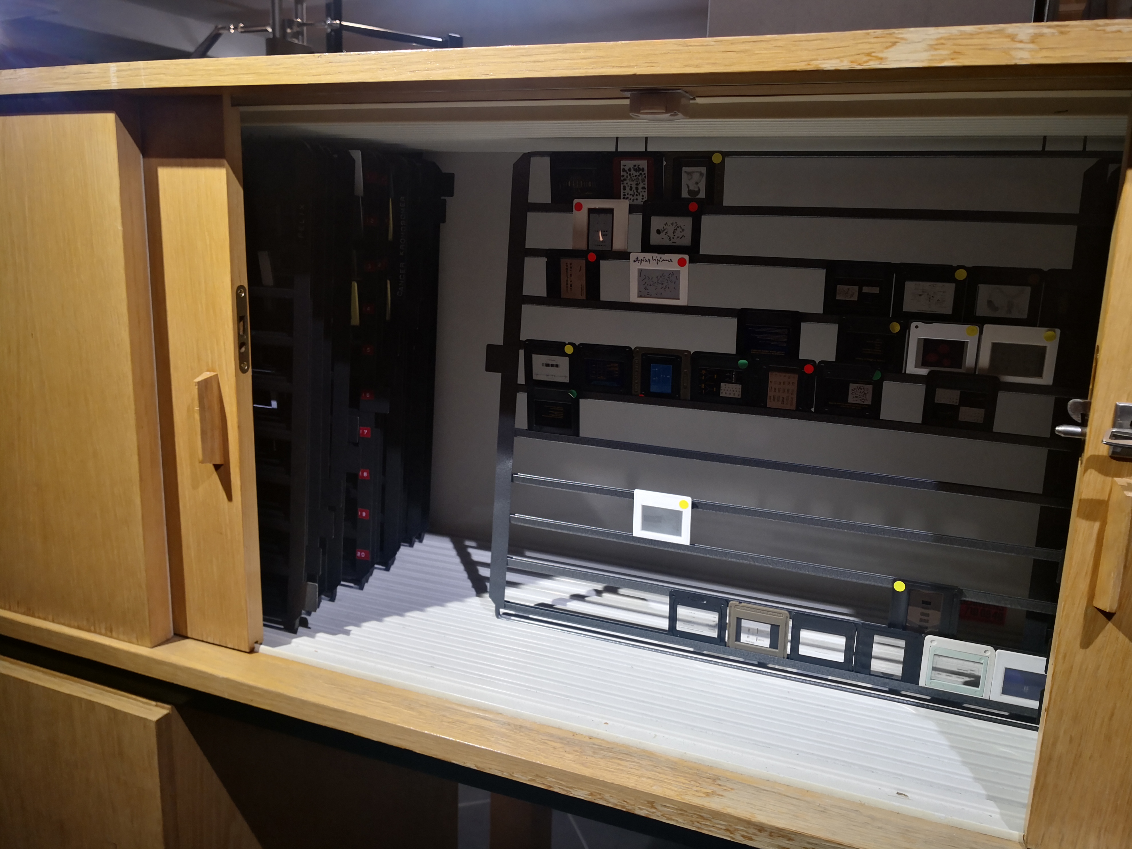 Współcześnie rolę magazynków z przeźroczami pełnią pliki PowerPoint. Nie można ich rozsypać. Zazwyczaj też prowadzący zajęcia sam steruje ich kolejnością. Ciekawe jak będą wyglądały wykłady za 75 lat? Mebel został przekazany do Muzeum z Katedry i Zakładu Biologii i Genetyki Medycznej.