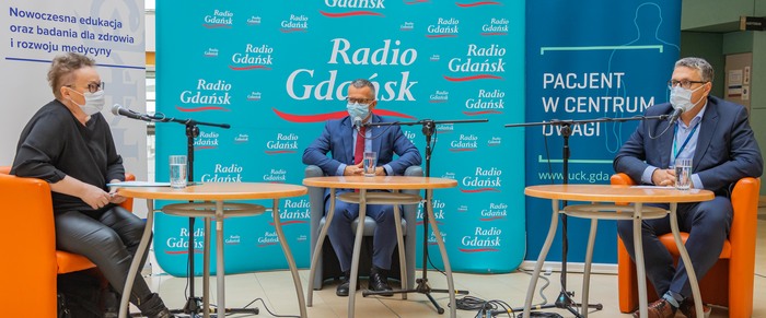 Po półrocznej przerwie wznowiliśmy audycje Bądź zdrów bez kolejki realizowane w ramach autorskiego projektu Gdańskiego Uniwersytetu Medycznego, Uniwersyteckiego Centrum Klinicznego w Gdańsku i Radia Gdańsk. Gośćmi październikowego spotkania byli: prof. Marcin Gruchała – rektor GUMed oraz Jakub Kraszewski – dyrektor naczelny UCK. Rozmowa dotyczyła aktualnej sytuacji epidemicznej oraz funkcjonowania Uczelni i Szpitala w dobie pandemii koronawirusa.