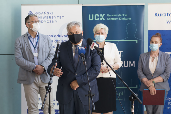 Współpraca szpitala klinicznego GUMed z Kuratorium Oświaty w Gdańsku i Pomorskim Urzędem Wojewódzkim w zakresie szczepień nastolatków w województwie pomorskim była tematem konferencji prasowej zorganizowanej 23 czerwca br. w Uniwersyteckim Centrum Klinicznym. W wydarzeniu udział wzięli: dr hab. Tomasz Smiatacz, kierownik Kliniki Chorób Zakaźnych GUMed, Jakub Kraszewski, dyrektor naczelny UCK, lek. Adam Sudoł, zastępca dyrektora naczelnego ds. logistyki medycznej oraz Małgorzata Bielang, pomorska kurator oświaty.