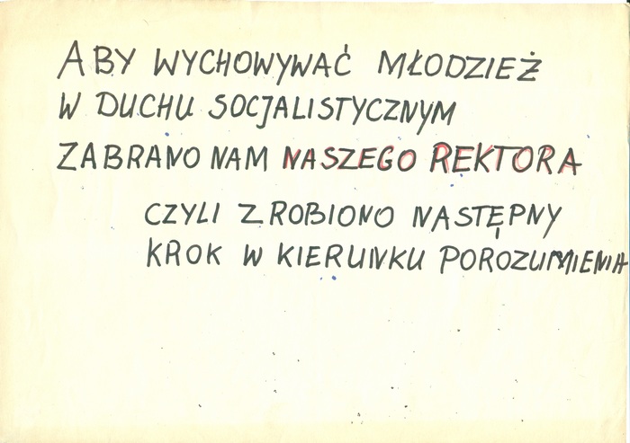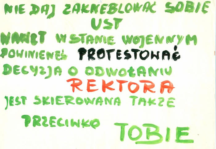 Treść plakatów, szczególnie zapis odwołujący się do wychowania młodzieży w duchu socjalistycznym może dziś dziwić. Stanowiły odwołanie do treści ówczesnej polityki. Przygotowanie a przede wszystkim umieszczenie w publicznym, dostępnym dla wielu osób miejscu plakatów protestacyjnych wymagało determinacji i odwagi. Osoba zatrzymana z takimi wywrotowymi w opinii władz plakatami zostałaby ukarana utratą pracy lub skreśleniem z listy studentów, nie wspominając o postepowaniu karnym.