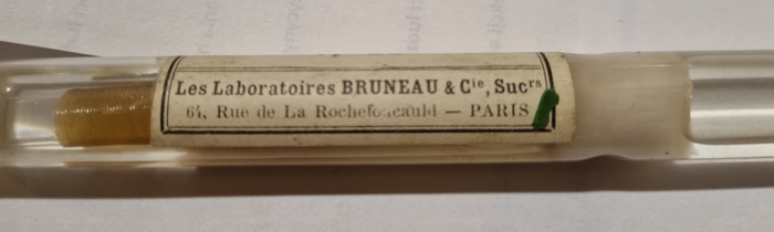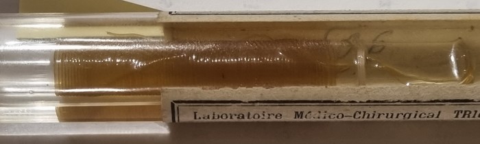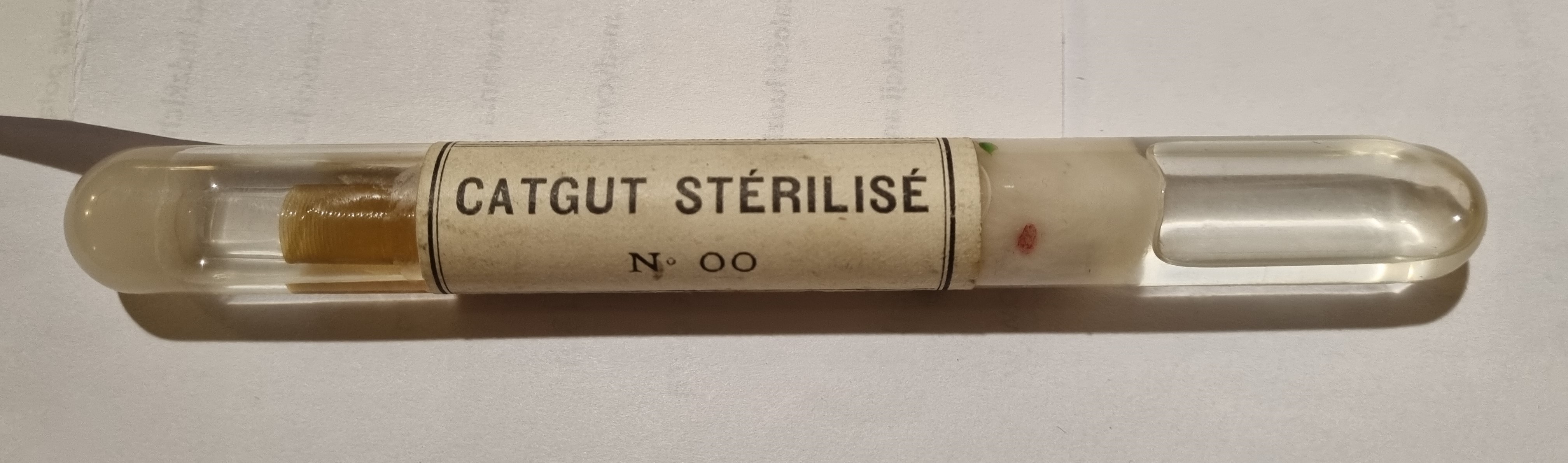 W zbiorach Muzeum GUMed znajdują się dwa oryginalne szklane opakowania zawierające katgut. Pierwsze, większe, to ampułka szklana w której katgut zanurzony jest w płynie. Wyprodukowana została przez Laboratoire Medico-Chirurgical TRIOLLET wchodzące prawdopodobnie w skład Les Laboratoires BRUNEAU&Cie, SUCrs, mieszczącej się przy Rue La Rochefoacauld 64 w Paryżu. Katgut – we francuskiej pisowni catgut, oznaczony jest numerem 00. W nieprzebranych zasobach Internetu można znaleźć fragmenty niedatowanych reklam firmy, niestety nie pojawia się w nich wzmianka o katgucie. Wnosząc po typografii, reklamy pochodzą z okresu początków XX w.