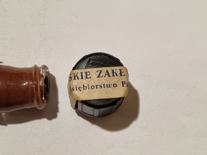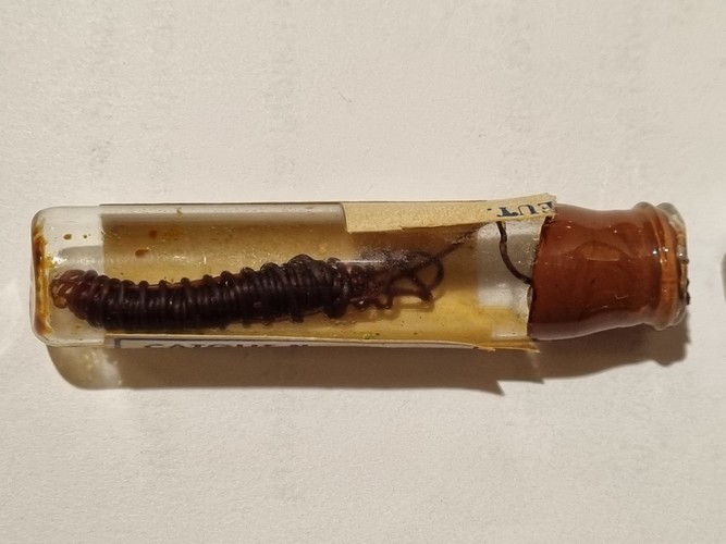 Drugie opakowanie, również szklane, zamknięte niegdyś zatyczką, przez którą wyprowadzono koniec nici. Usunięcie zakrętki z tworzywa umożliwiało wyciągniecie odpowiedniej jej ilości, co na pewno ułatwiało pracę instrumentariuszki lub chirurga. Producentem katgutu – opisanego jako catgut są Warszawskie Zakłady Farmaceutyczne. Nić tak jak opisany powyżej francuski wyrób miała numer 0. Wiele fabryk podając numer serii swych produktów dwie ostatnie cyfry rezerwowało dla roku produkcji. Nasz katgut ma numer 900953. Czy zatem wyprodukowano go w 1953 r.?