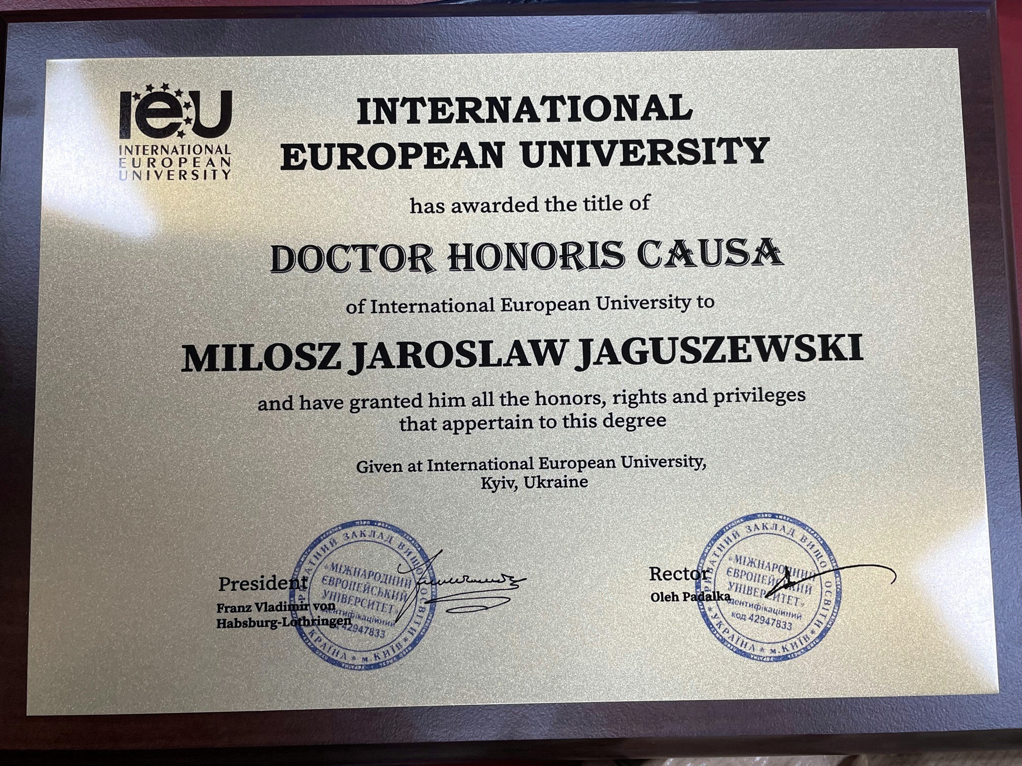 Międzynarodowy Uniwersytet Europejski w Kijowie (IEU) zyskał nowego doktora honoris causa. Uczelnia nadała ten zaszczytny tytuł prof. dr. hab. Miłoszowi Jaguszewskiemu z I Katedry i Kliniki Gdańskiego Uniwersytetu Medycznego w uznaniu szczególnych zasług dla nauki w dziedzinie medycyny. Uroczystość odbyła się 16 września 2021 r. Wraz z prof. Jaguszewskim godnością honorową zostali wyróżnieni: Wiktor Juszczenko – premier (1999-2001), a w latach 2005-2010 prezydent Ukrainy oraz Rostyslav Valikhnovski – chirurg, duchowny Ukraińskiego Kościoła Prawosławnego, zastępca szefa Administracji Państwowej Prezydenta Ukrainy w latach 2008-2010, doradca ministra ds. sytuacji nadzwyczajnych Ukrainy (2010-2012).