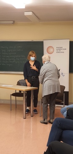 Spotkanie dotyczyło komunikacji w sytuacjach etycznie trudnych. Uczestnicy mieli okazję do wspólnej dyskusji na temat aspektów bioetycznych w medycynie podczas wykładu dr. Jakuba Wiśniewskiego. Warsztaty praktyczne poprowadziła Anna Orłowska, psycholog z Puckiego Hospicjum, która podjęła temat najczęstszych obaw studentów dotyczących przekazywania niekorzystnej diagnozy pacjentom oraz sposobów radzenia sobie z trudnymi emocjami. Na zakończenie studenci spróbowali swoich sił w samodzielnej pracy, odgrywając scenki, w których w rolę pacjentki wcielała się profesjonalna aktorka.