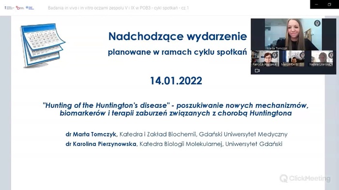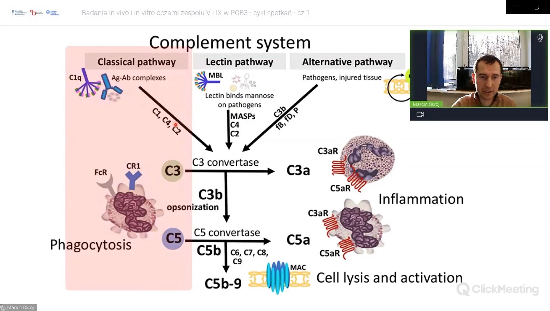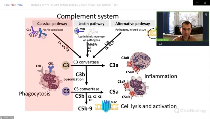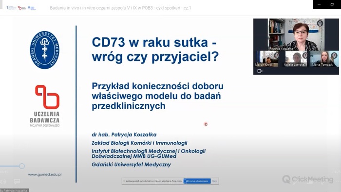 Spotkanie rozpoczęła dr Marta Tomczyk z Katedry i Zakładu Biochemii GUMed, koordynator zespołu V POB 3, nakreślając ideę cyklicznych spotkań i zapraszając do udziału w kolejnych nadchodzących wydarzeniach. Wykład pt. CD73 w raku sutka – wróg czy przyjaciel? Przykład konieczności doboru właściwego modelu do badań przedklinicznych wygłosiła dr hab. Patrycja Koszałka z Zakładu Biologii Komórki i Immunologii GUMed, koordynator zespołu V oraz członek zespołu IX i X w POB 3. Druga część webinaru była poświęcona tematyce zastosowania białek układu dopełniacza do wzmacniania aktywności cytotoksycznej immunoterapeutyków, którą przybliżył dr hab. Marcin Okrój, prof. uczelni z Zakładu Biologii Komórki i Immunologii GUMed, członek zespołu V, VIII oraz IX w POB 3. Uczestnicy mieli możliwość zadawania pytań na czacie. Ponadto prezenterzy zaprosili do kontaktu osoby zainteresowane poruszaną tematyką.