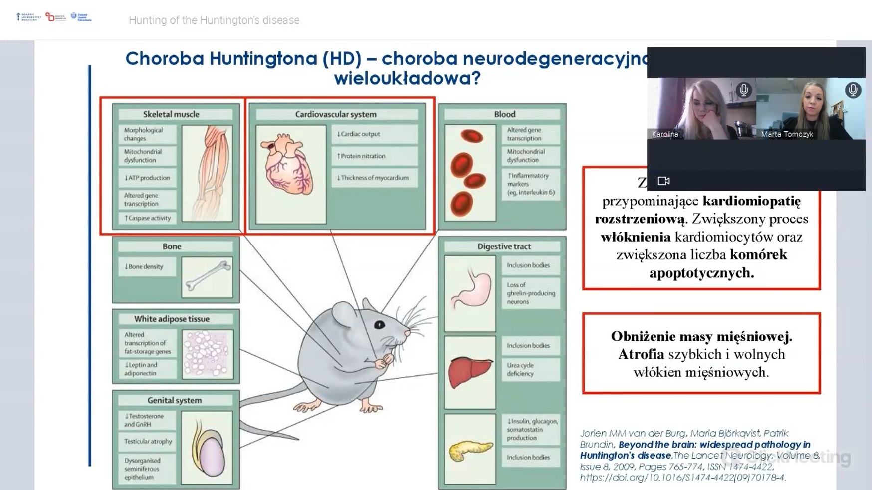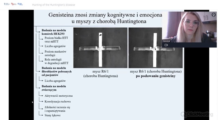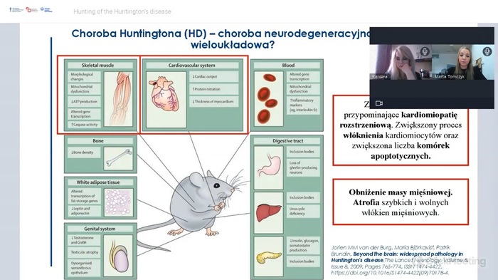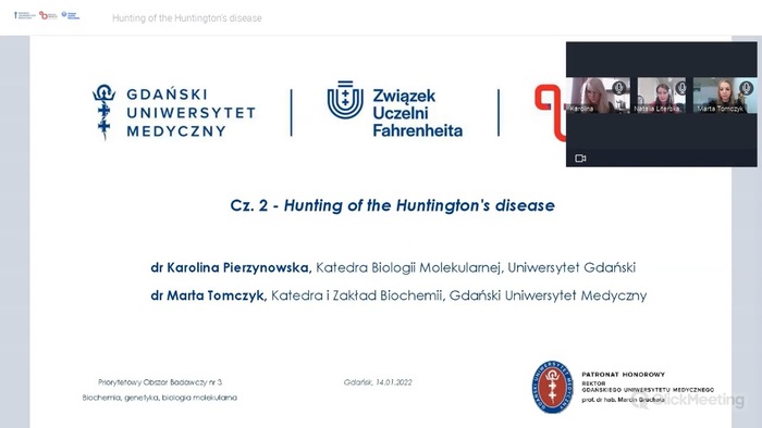 Spotkanie rozpoczęła i poprowadziła mgr inż. Natalia Literska. Gospodarzem ze strony Gdańskiego Uniwersytetu Medycznego była dr Marta Tomczyk z Katedry i Zakładu Biochemii, koordynator zespołu V Priorytetowego Obszaru Badawczego nr 3, która wygłosiła wykład pt. Poszukiwanie nowych mechanizmów, biomarkerów i terapii miopatii związanych z chorobą Huntingtona. Gościnnie w wydarzeniu wzięła udział dr Karolina Pierzynowska z Katedry Biologii Molekularnej UG z wystąpieniem pt. Podłoże molekularne oraz nowe strategie terapeutyczne choroby Huntingtona. Specjalistki współpracują ze sobą od 5 lat, początkowo w zakresie badań in vitro, a następnie in vivo z wykorzystaniem mysiego modelu choroby Huntingtona.