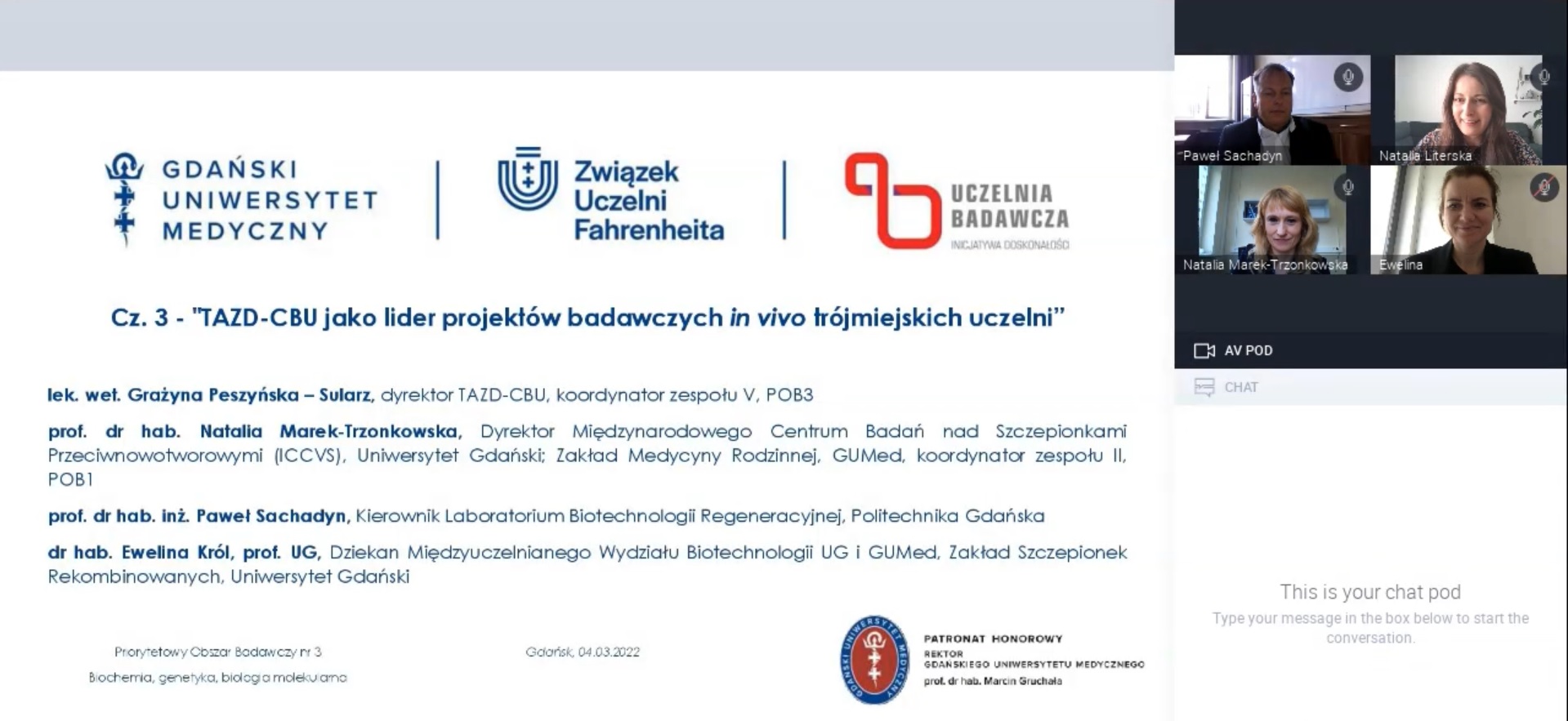 Sześćdziesiąt dziewięć osób wzięło udział w trzecim spotkaniu z serii Badania in vivo i in vitro oczami zespołu V i IX w POB 3 – cykl spotkań o współpracach wewnątrz- i międzyuczelnianych, które odbyło się 4 marca 2022 r. z wykorzystaniem platformy Clickmeeting. Temat spotkania brzmiał TAZD-CBU jako lider projektów badawczych in vivo trójmiejskich uczelni. Patronat nad wydarzeniem objął rektor GUMed prof. Marcin Gruchała oraz Związek Uczelni w Gdańsku im. Daniela Fahrenheita.