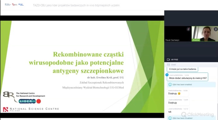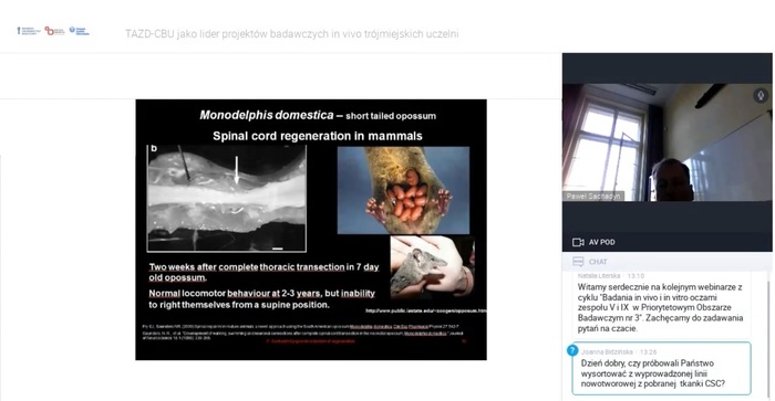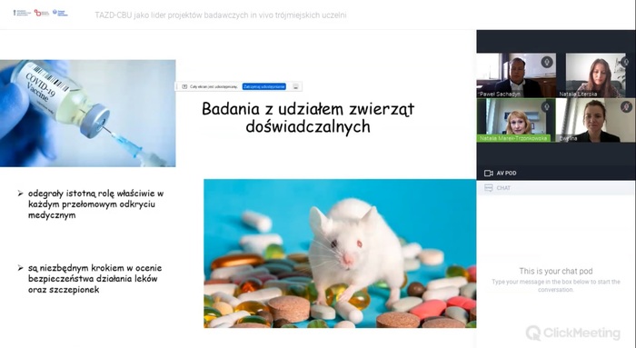 Webinar rozpoczęła i poprowadziła mgr inż. Natalia Literska z Laboratorium Bioanalitycznego w Katedrze i Zakładzie Biochemii GUMed, z kolei dyrektor Trójmiejskiej Akademickiej Zwierzętarni Doświadczalnej (TAZD) lek. wet. Grażyna Peszyńska-Sularz zaprosiła przedstawicieli jednostek współpracujących ze Zwierzętarnią do wygłoszenia wykładów eksperckich. Uczestnicy webinaru mieli okazję posłuchać prezentacji o różnych typach badań prowadzonych w oparciu o współpracę z jednostką ogólnouczelnianą, jaką jest TAZD.