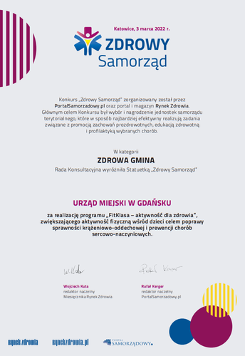 Projekt FitKlasa – aktywność dla zdrowia realizowany przez Urząd Miejski w Gdańsku we współpracy z Gdańskim Uniwersytetem Medycznym oraz Gdańskim Ośrodkiem Promocji Zdrowia (GOPZ) został doceniony przez redakcję PortalSamorzadowy.pl i magazynu Rynek Zdrowia. Organizatorzy konkursu Zdrowy Samorząd przyznali Urzędowi nagrodę w kategorii Zdrowa Gmina w uznaniu sukcesów odniesionych w związku z wdrożonym programem.
