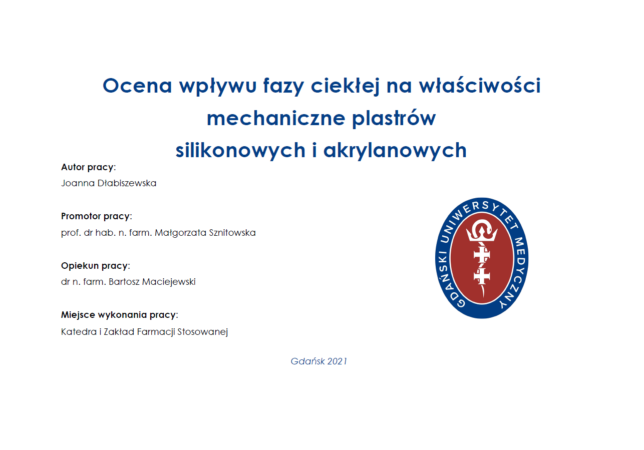 Drugie miejsce zajęła Joanna Dłabiszewska za pracę pt. Ocena wpływu fazy ciekłej na właściwości mechaniczne plastrów silikonowych i akrylanowych wykonaną w Katedrze i Zakładzie Farmacji Stosowanej pod kierownictwem prof. Małgorzaty Sznitowskiej.