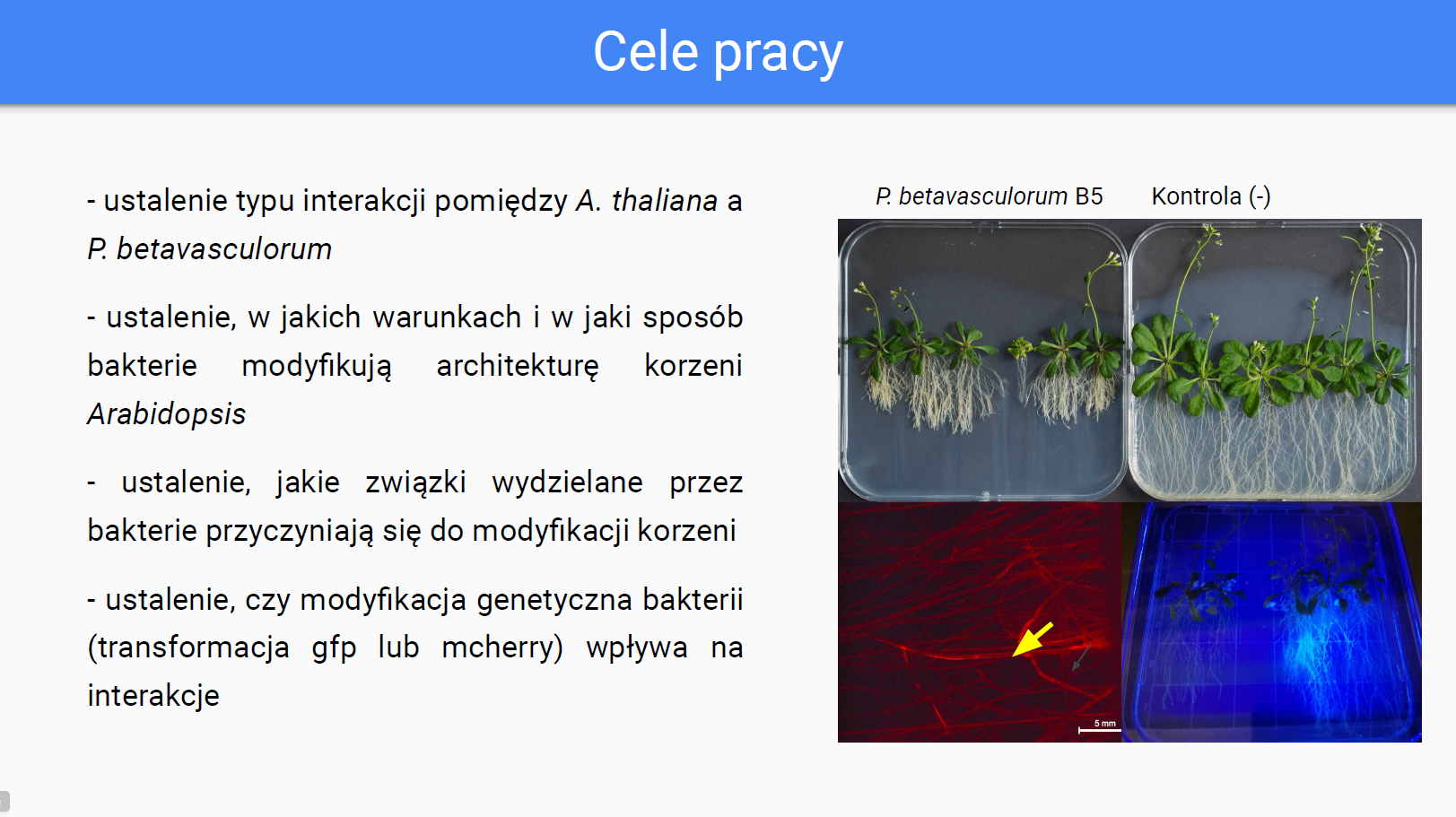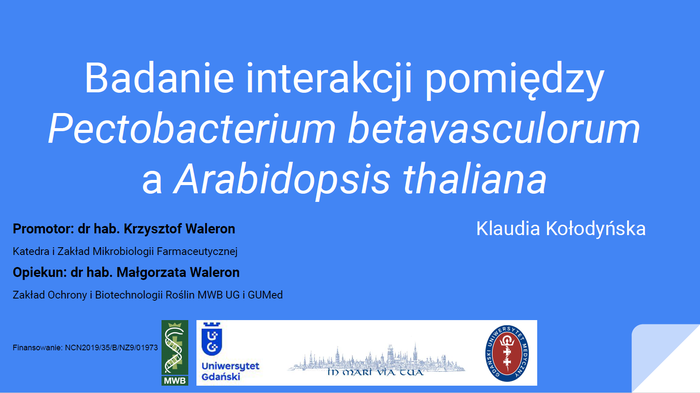 Trzecie miejsce przyznano Klaudii Kołodyńskiej za pracę pt. Badanie interakcji pomiędzy Pectobacterium betavasculorum a Arabidospis thaliana stworzoną w Katedrze i Zakładzie Mikrobiologii Farmaceutycznej pod kierownictwem dr. hab. Krzysztofa Walerona. Praca została również uhonorowana nagrodą publiczności.