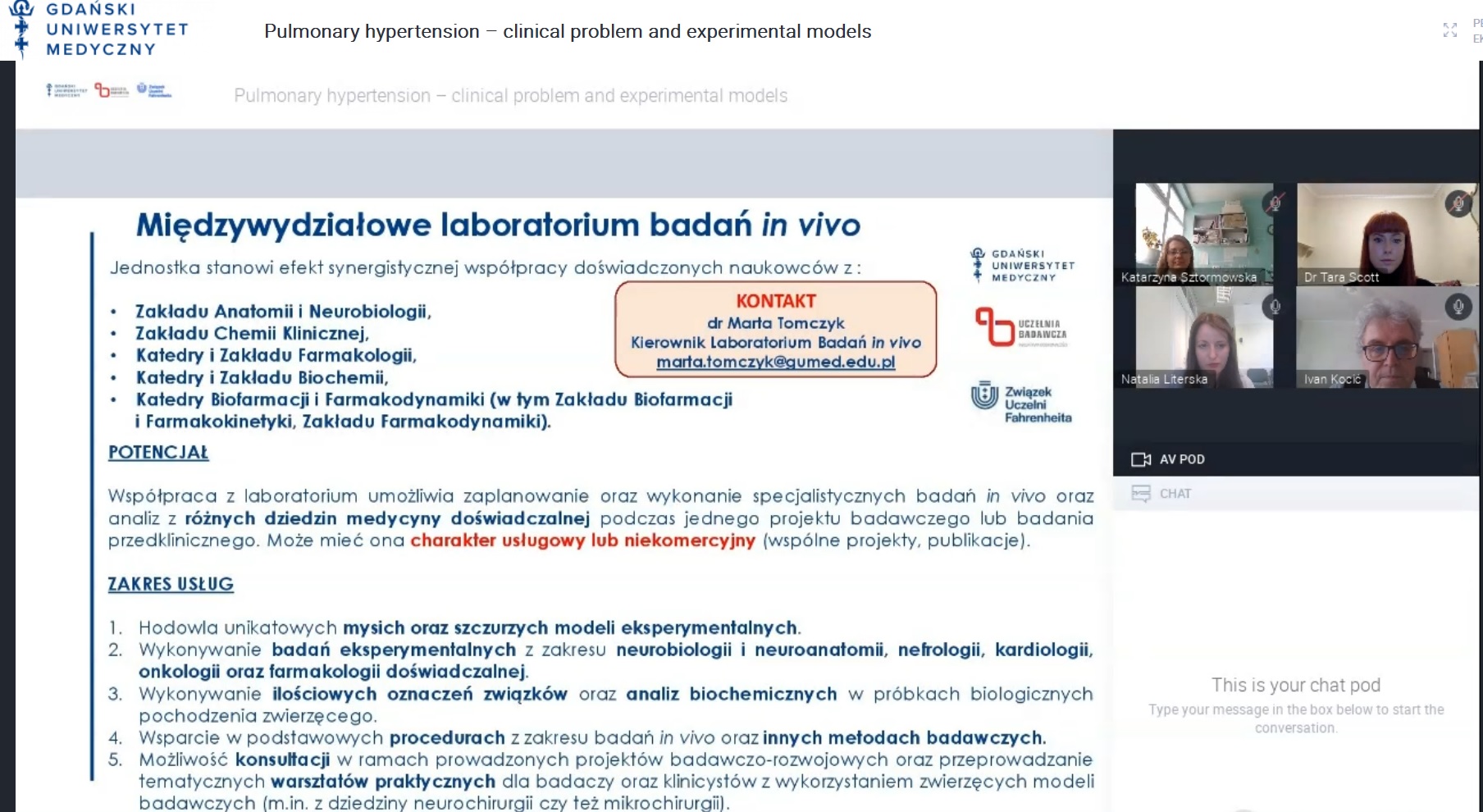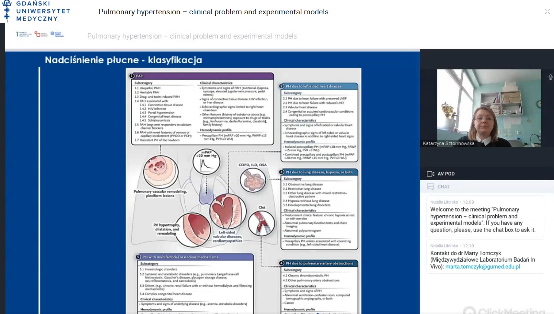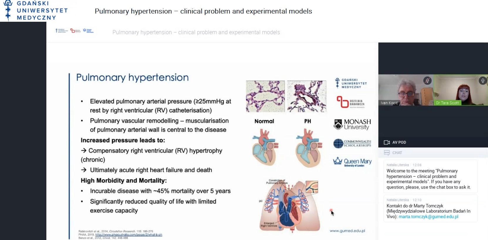 Gospodarzem spotkania był prof. Ivan Kocić, kierownik Katedry i Zakładu Farmakologii Gdańskiego Uniwersytetu Medycznego, członek zespołu V w POB 3, a także członek zespołu VI w POB 2. Podczas webinaru prof. Kocić wygłosił wykład pt. Nadciśnienie płucne – problem kliniczny i modele doświadczalne.