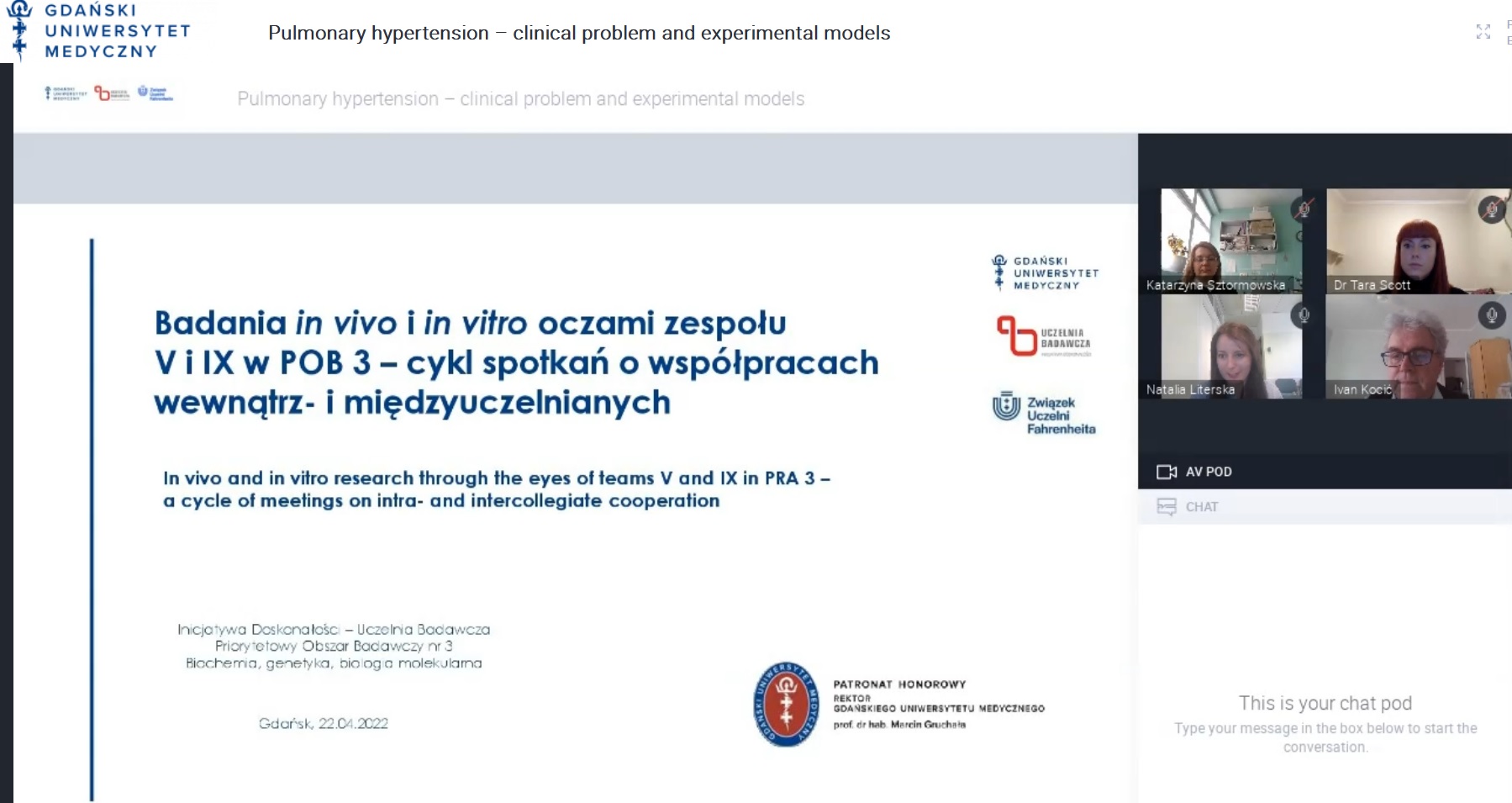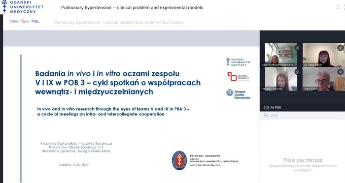 Czterdzieści sześć osób wzięło udział w spotkaniu pt. Nadciśnienie płucne – problem kliniczny i modele doświadczalne, które odbyło się 22 kwietnia 2022 r. w ramach serii Badania in vivo i in vitro oczami zespołu V i IX w POB 3 – cykl spotkań o współpracach wewnątrz- i międzyuczelnianych. Webinar przeprowadzono z wykorzystaniem platformy Clickmeeting. Patronat nad wydarzeniem objął rektor GUMed prof. Marcin Gruchała oraz Uczelnie Fahrenheita.