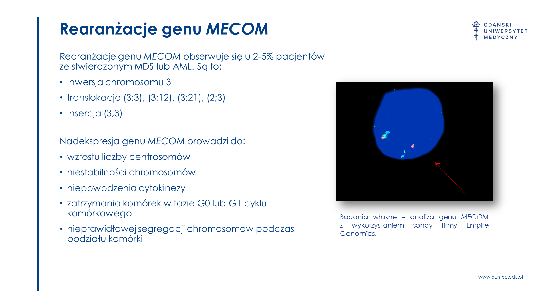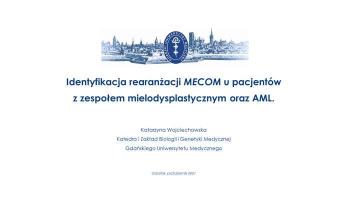 Reprezentantka Gdańskiego Uniwersytetu Medycznego mgr Katarzyna Wojciechowska z Katedry i Zakładu Biologii i Genetyki Medycznej zajęła II miejsce w Ogólnopolskim Konkursie Prac Magisterskich absolwentów kierunku analityka medyczna, którego finał odbył się 9 maja 2022 r. w formie online. Nagrodzona praca pt. Identyfikacja rearanżacji MECOM u pacjentów z zespołem mielodysplastycznym oraz AML powstała w Katedrze i Zakładzie Biologii i Genetyki Medycznej pod przewodnictwem kierownika jednostki prof. Bartosza Wasąga.