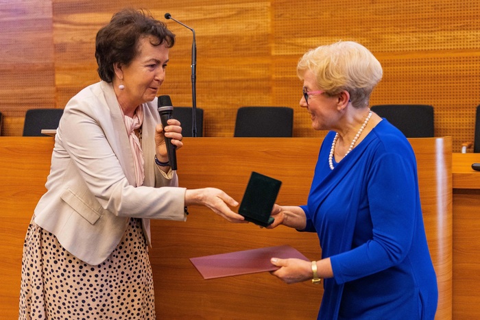 Wiceprzewodnicząca Sejmiku Województwa Pomorskiego Hanna Zych-Cisoń wręcza medal prof. Marii Dudziak
