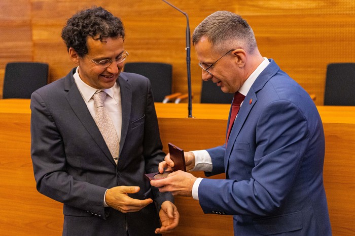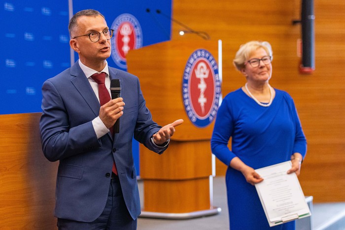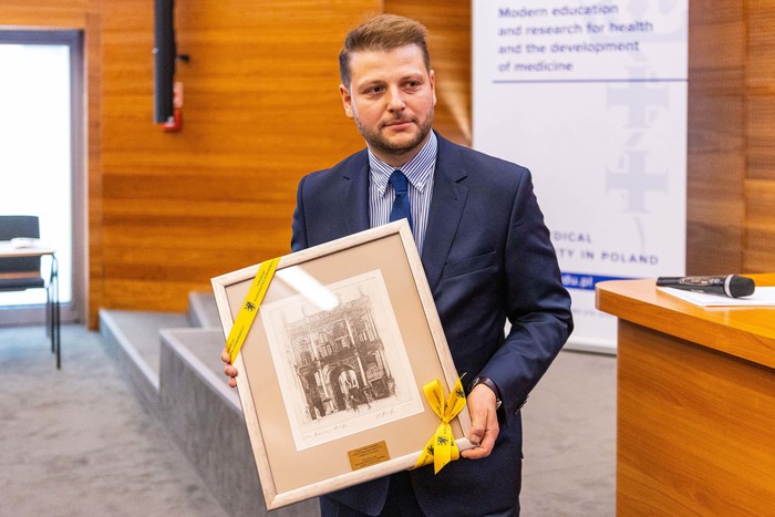 Profesor Cracowski nie tylko wygłosił wykład pt. Microcirculation – physiology, pharmacology and pathogenesis. Z rąk rektora prof. Marcina Gruchały otrzymał medal Zasłużonemu GUMed w dowód uznania za wieloletnią współpracę naukową z Zakładem Diagnostyki Chorób Serca w zakresie badań nad mikrokrążeniem.