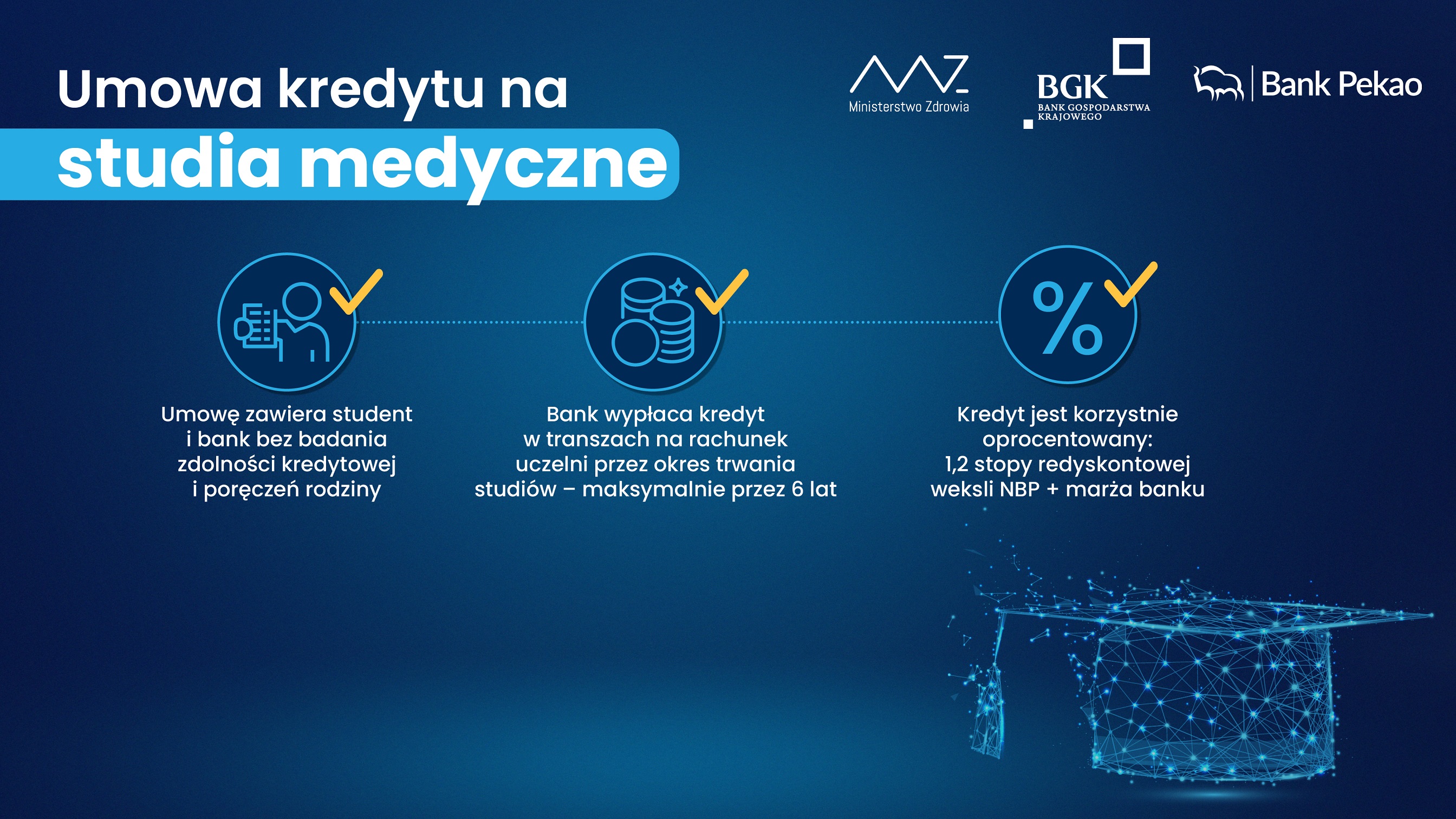 Program wsparcia studentów będzie realizowany we współpracy z Bankiem Gospodarstwa Krajowego. Kredytów będzie udzielał Bank Pekao SA. Szczegółowe informacje o wdrażanym programie dostępne są na stronie Ministerstwa Zdrowia oraz w dotyczącym go rozporządzeniu Ministra Zdrowia.