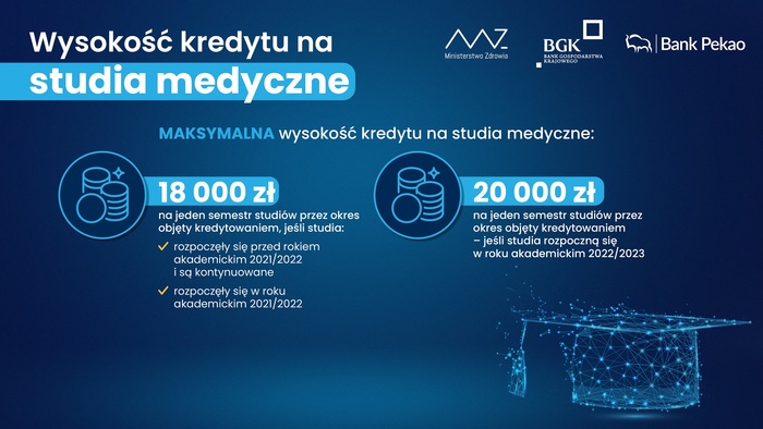 W ramach programu studenci będą mogli otrzymać pomoc w wysokości 20 tys. zł na semestr w przypadku złożenia wniosku na rok akademicki 2022/2023 i kolejne oraz 18 tys. zł na semestr na skredytowanie opłat poniesionych w roku akademickim 2021/2022, przy czym wówczas taka stawka będzie obowiązywać do końca studiów. Nabór wniosków rozpoczął się 18 lipca br. i potrwa do 30 września br. (w przypadku kredytu na rok akademicki 2021/2022) lub do 21 dnia od rozpoczęcia semestru (w przypadku wsparcia na rok 2022/2023). Student może liczyć na umorzenie kredytu, jeśli w okresie 12 lat od ukończenia studiów przepracuje 10 lat w publicznym systemie ochrony zdrowia i uzyska specjalizację w dziedzinie uznanej za priorytetową według rozporządzenia Ministra Zdrowia.