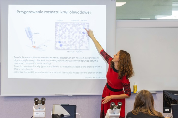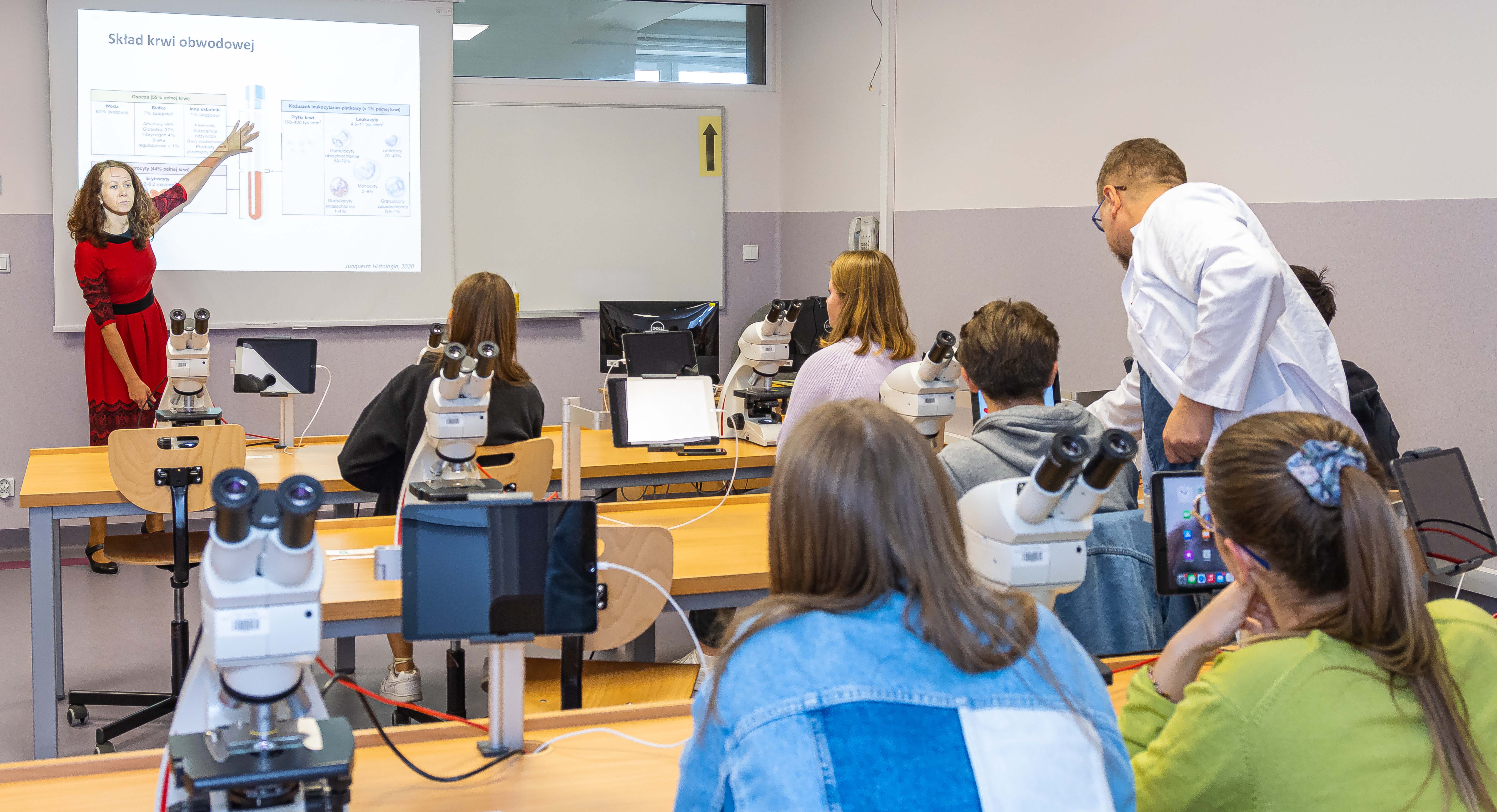 Blisko 70 uczniów z VI LO w Gdyni i XV LO w Gdańsku wzięło udział w warsztatach zorganizowanych w ramach Dnia Otwartego, który 15 września br. zorganizowało Studenckie Koło Naukowe przy Katedrze i Zakładzie Histologii GUMed. Spotkanie pt. Człowiek pod mikroskopem koordynowała dr Grażyna Kotlarz, opiekun SKN wraz z dr Agatą Wrońską. Na młodzież czekał pokaz multimedialny dotyczący krwi oraz mikroskopowa prezentacja komórek tej tkanki w rozmazach pod imersją. Przygotowano także pokazy innych tkanek dostępnych do oglądania pod różnym powiększeniem w mikroskopie świetlnym. Obserwację i archiwizację obrazu ułatwiał cyfrowy interaktywny system nauczania histologii, w skład którego wchodzą kamery mikroskopowe sprzężone z tabletami.