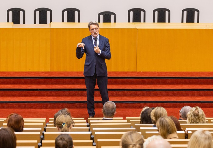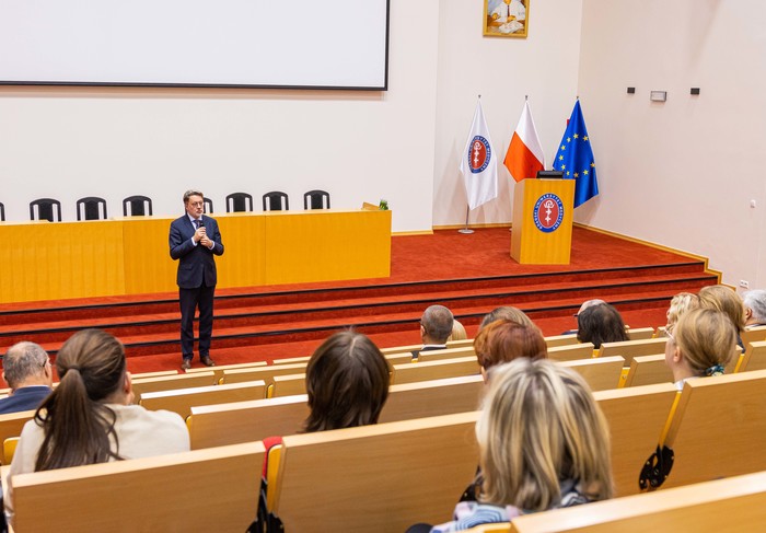 Ponad 200 osób, pracowników naukowo-dydaktycznych i dydaktycznych GUMed, wzięło udział w wykładzie Retoryka jako sztuka dialogu dr. hab. Michała Rusinka, sekretarza noblistki Wisławy Szymborskiej. Spotkanie zostało organizowane 21 października br. z inicjatywy dr hab. Agnieszki Zimmermann, prof. uczelni, prorektor ds. jakości kształcenia w ramach cyklu Rozmowy o dydaktyce.
