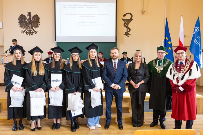 W kolejnej części uroczystości swoje przyrzeczenie złożyli odbierający dyplomy absolwenci kierunku przemysł farmaceutyczny i kosmetyczny. Ponownie wyróżniającym się absolwentom wręczono listy gratulacyjne i nagrody książkowe. Za wyniki w nauce nagrodzono: mgr Aleksandrę Gładką, mgr Wiktorię Konopkę oraz mgr Aleksandrę Cienkosz. Za działalność na rzecz społeczności akademickiej wyróżniona została mgr Wiktoria Konopka. Dodatkową nagrodę za wyróżniające się wyniki w nauce oraz za działalność na rzecz społeczności akademickiej ufundowały Zakłady Farmaceutyczne Polpharma SA. Wyróżnienie z rąk Andrzeja Dziubana, członka zarządu i kierownika ds. relacji zewnętrznych Polpharmy odebrała mgr Wiktoria Konopka.