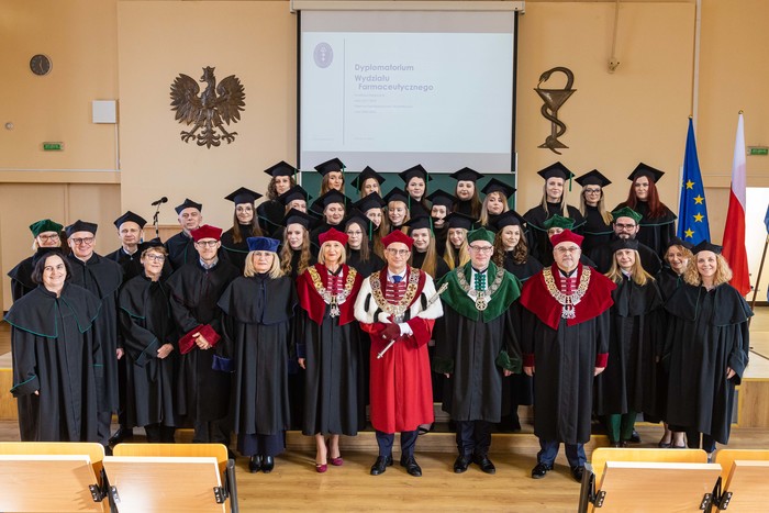 Wręczenie dyplomów ukończenia studiów absolwentom kierunków analityka medyczna rocznika 2017-2022 oraz przemysł farmaceutyczny i kosmetyczny rocznika 2020-2022 odbyło się 4 listopada 2022 r. w Auditorium Maximum Wydziału Farmaceutycznego.