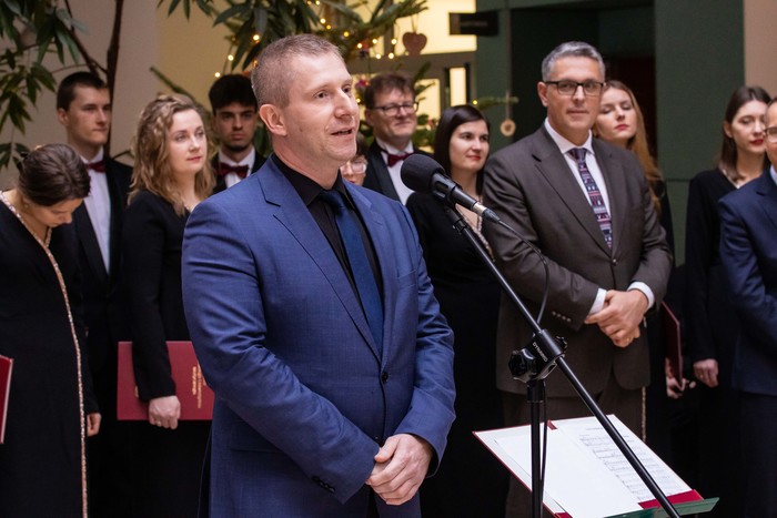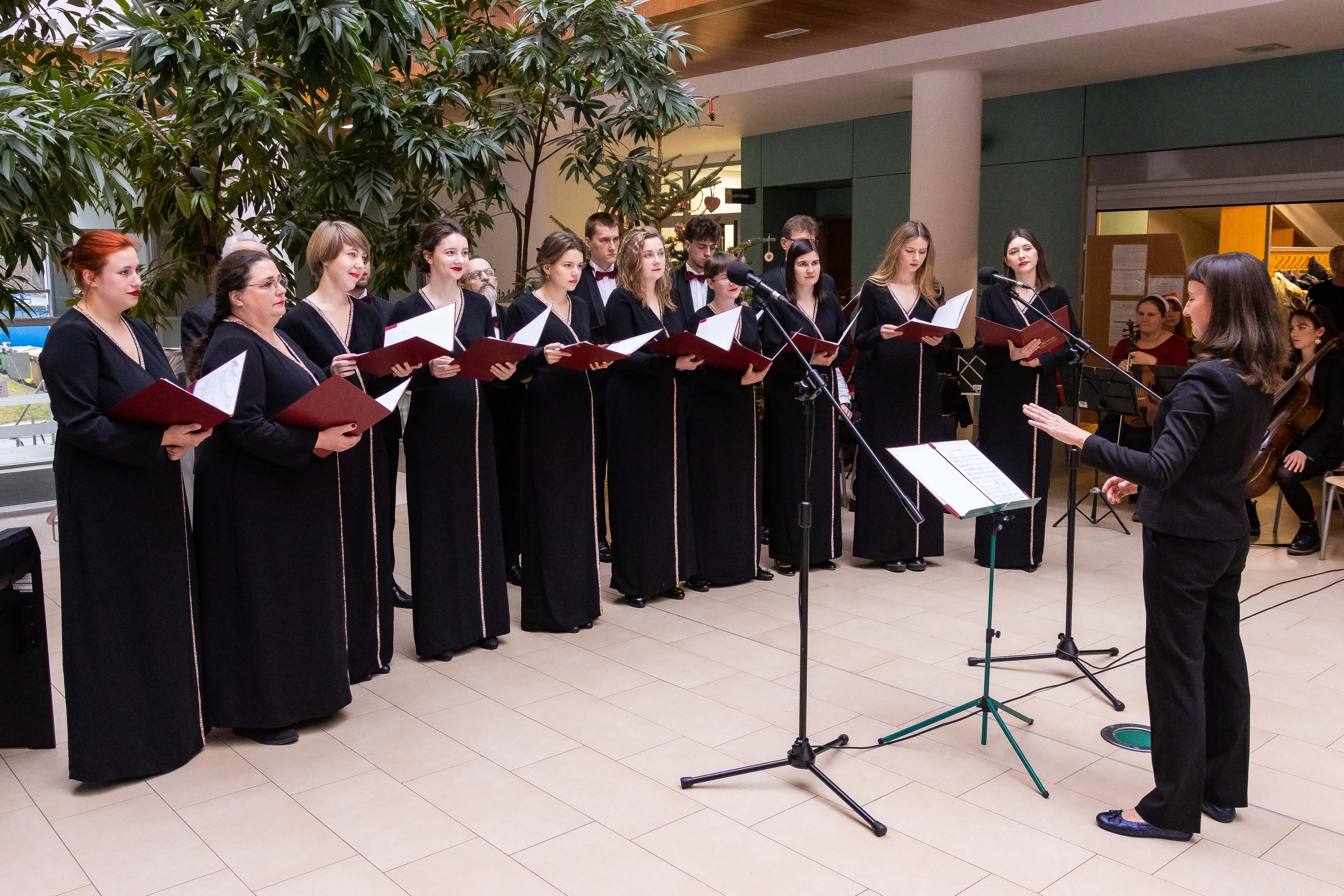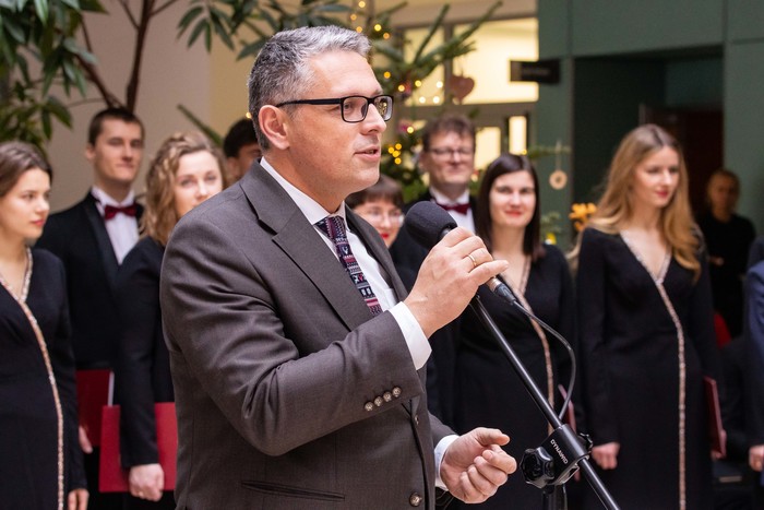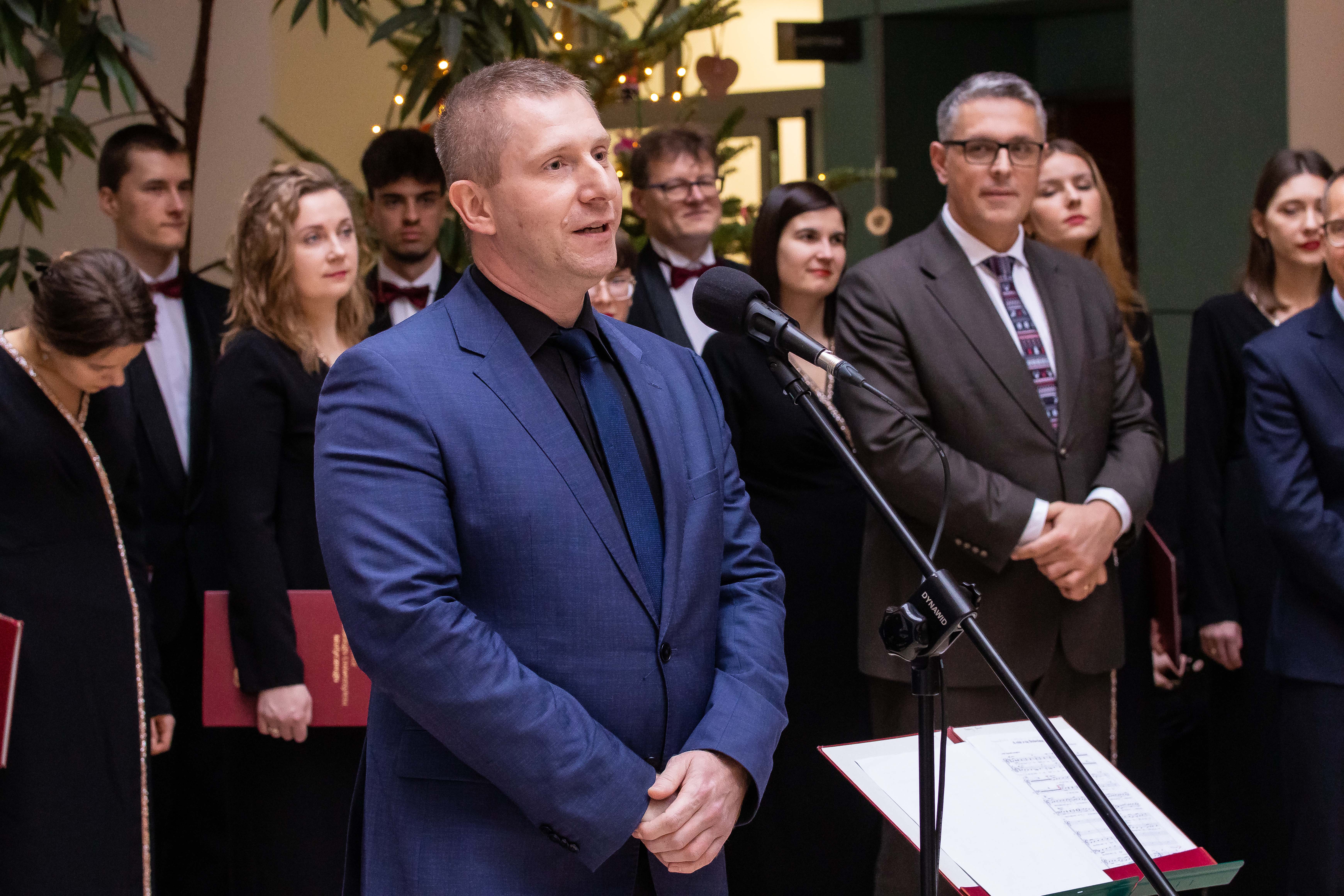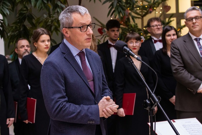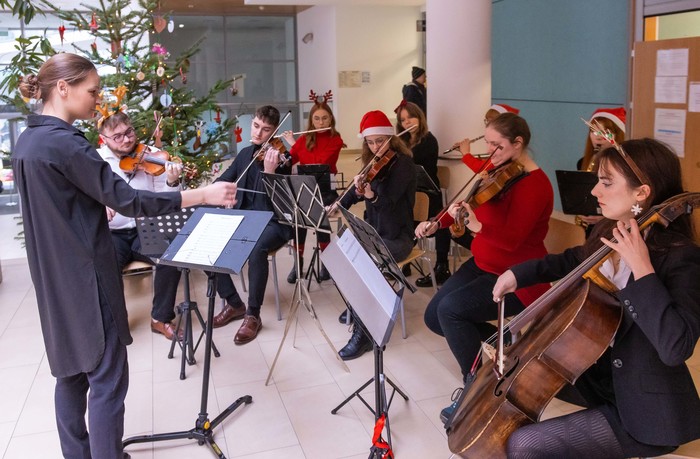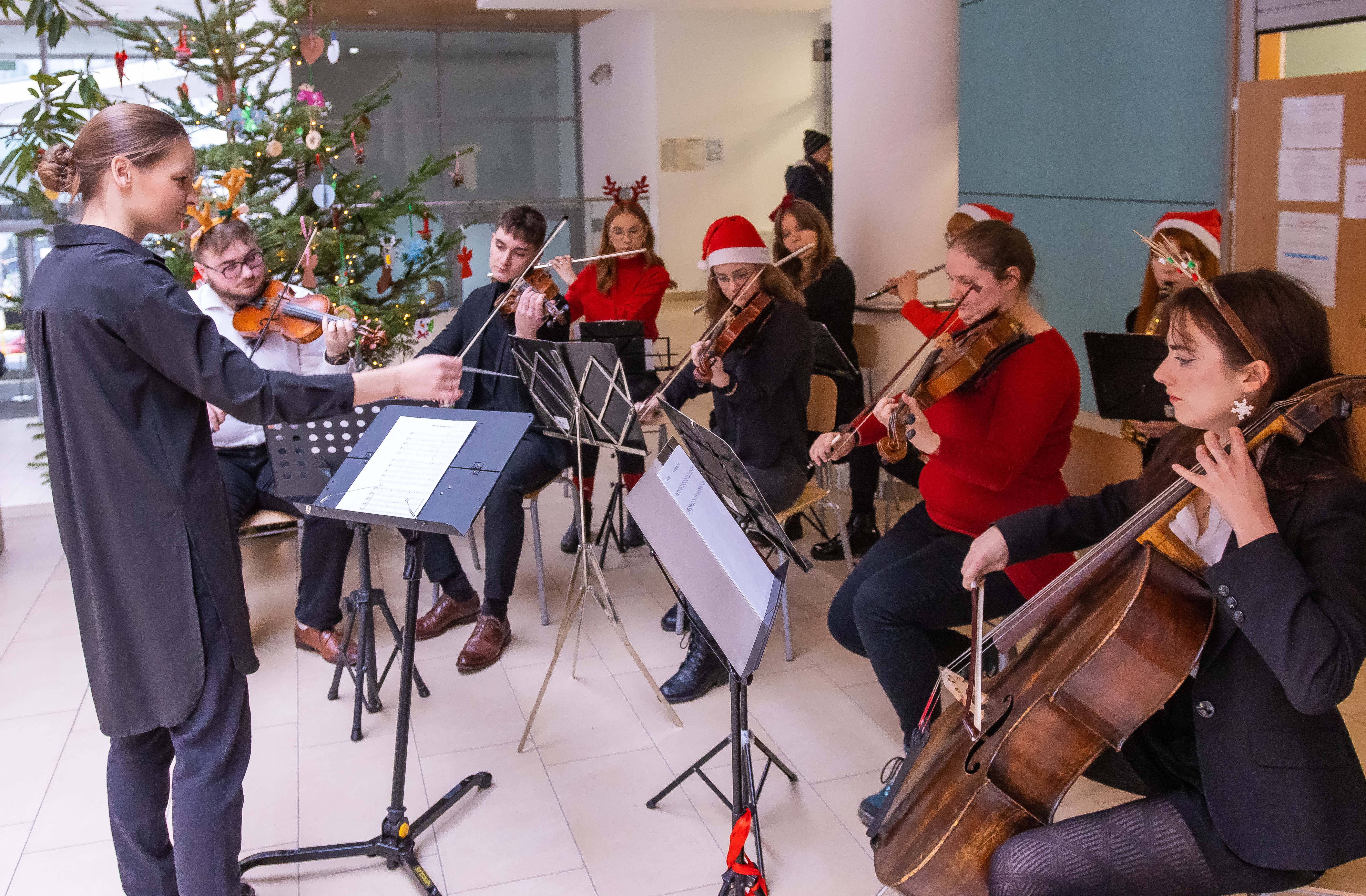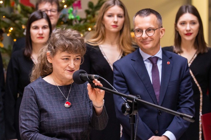 Społeczność Gdańskiego Uniwersytetu Medycznego, Uniwersyteckiego Centrum Klinicznego, Uniwersyteckiego Centrum Medycyny Morskiej i Tropikalnej, Uniwersyteckiego Centrum Stomatologicznego i Centrum Medycyny Rodzinnej spotkała się 21 grudnia br. w Centrum Medycyny Inwazyjnej by złożyć sobie świąteczne życzenia. W imieniu władz Uczelni wszystkiego co najlepsze życzył prof. Marcin Gruchała, rektor GUMed. Życzenia przekazali także dyrektor UCK Jakub Kraszewski, dyrektor UCMMiT prof. Marcin Renke, prezes UCS dr Mirosława Pellowska-Piontek i prezes CMR dr Piotr Gutknecht. O oprawę muzyczną spotkania zadbały Chór i Orkiestra Gdańskiego Uniwersytetu Medycznego. Chórzyści zaśpiewali najpiękniejsze polskie kolędy, natomiast Orkiestra zagrała świąteczne przeboje.