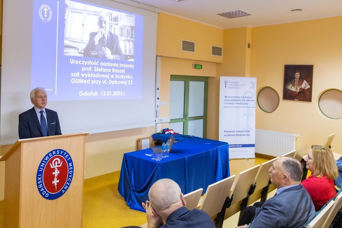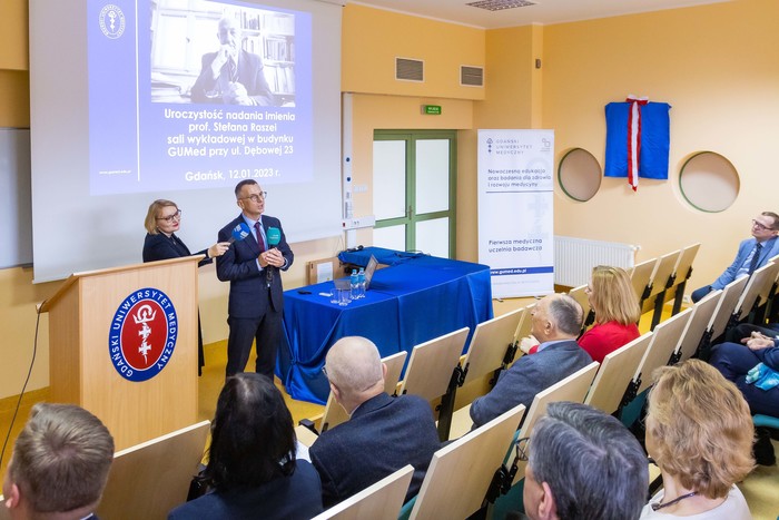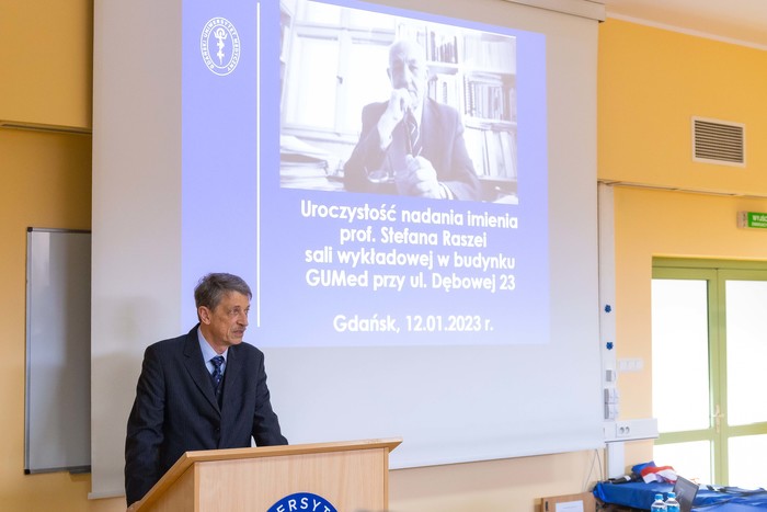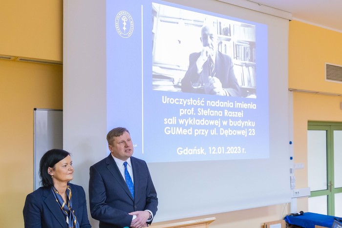 – To bardzo ważny dzień dla naszej Uczelni – podkreślił prof. Marcin Gruchała, rektor Gdańskiego Uniwersytetu Medycznego. – W stulecie urodzin prof. Stefana Raszei, wieloletniego kierownika Katedry i Zakładu Medycyny Sądowej, byłego dziekana, prorektora i rektora naszej Uczelni, nadaliśmy Jego imię sali wykładowej w Katedrze Medycyny Sądowej.