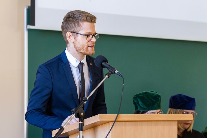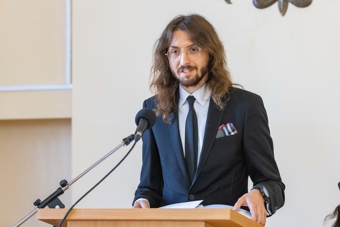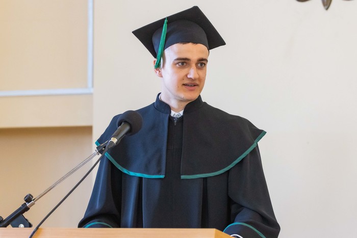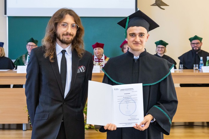Z rąk starosty V r. farmacji Bartosza Piątkowiaka nagrodę Uczelnianego Samorządu Studenckiego otrzymał mgr farm. Bartłomiej Pesta.