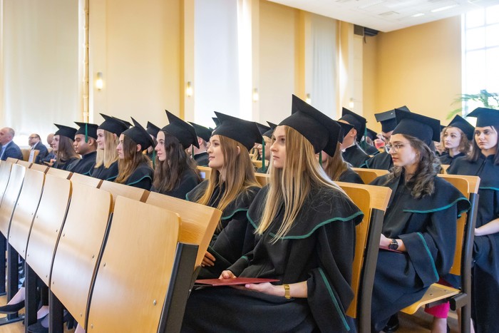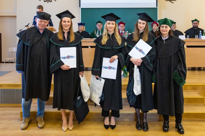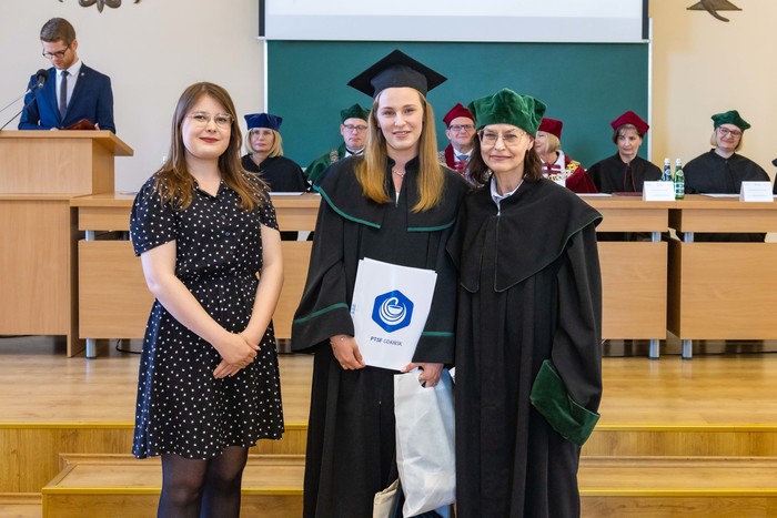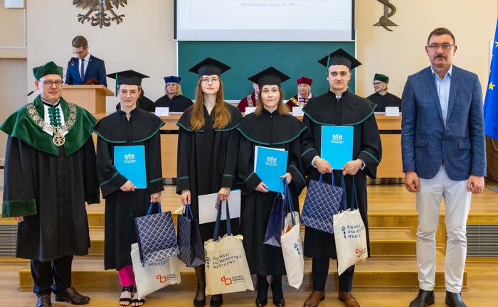Po złożeniu przyrzeczenia absolwenci odebrali dyplomy z rąk prorektora prof. Michała Markuszewskiego i dziekana prof. Wojciecha Kamysza. Wyróżniającym się absolwentom wręczono listy gratulacyjne i nagrody książkowe ufundowane przez Gdańską Okręgową Izbę Aptekarską (GOIA). Za wyniki w nauce nagrodzono: mgr farm. Natalię Kowalską, mgr farm. Martynę Leyk i mgr farm. Alicję Labudę. Za działalność na rzecz społeczności akademickiej wyróżniony został mgr farm. Bartłomiej Pesta. Ponadto mgr farm. Beata Karpińska została uhonorowana przez prezesa GOIA mgr. Michała Pietrzykowskiego nagrodą im. prof. Stanisława Janickiego.