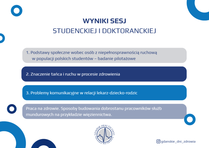 Zwycięzcami sesji okazali się Marcin Grajek wraz z Karoliną Bednarek z pracą pt. Podstawy społeczne wobec osób z niepełnosprawnością ruchową w populacji polskich studentów – badanie pilotażowe. Drugie miejsce przypadło Tomaszowi Rachwalskiemu za pracę pt. Znaczenie tańca i ruchu w procesie zdrowienia, a trzecie miejsce zajęli Julia Szewczyk, Michał Świta, Sylwia Szelc i Anna Szuciak z pracą pt. Problemy komunikacyjne w relacji lekarz-dziecko-rodzic.