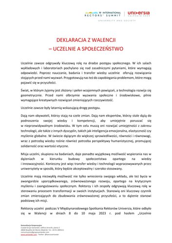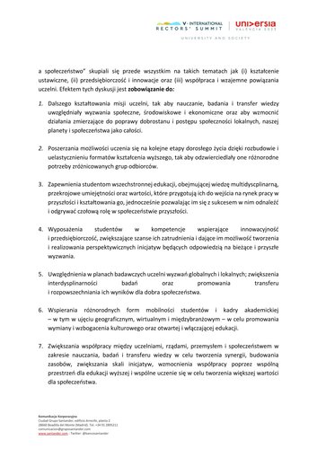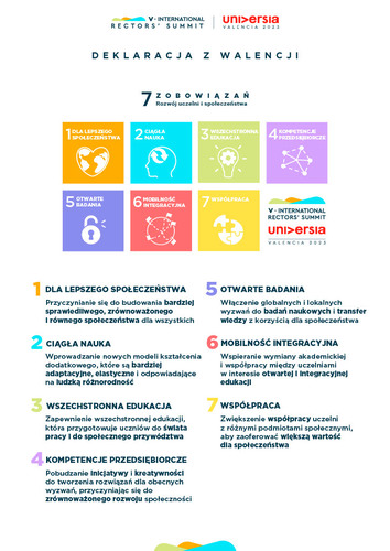 Spotkanie było wyjątkowym forum debaty pod hasłem Uczelnia a społeczeństwo. Jego uczestnicy dyskutowali, w jaki sposób uczelnie mogą jeszcze skuteczniej działać w trzech obszarach: uczenia się przez całe życie, przedsiębiorczości i innowacji oraz tworzenia sieci i relacji pomiędzy uczelniami z całego świata. Dwudniowe obrady zaowocowały opracowaniem Deklaracji z Walencji, która odzwierciedla zaangażowanie rektorów i świata akademickiego w rozwój społeczeństwa. Jak podkreśliła prof. Agnieszka Zimmermann, zapisy dokumentu odwołują się do zapewnienia studentom wszechstronnej edukacji, obejmującej wiedzę multidyscplinarną, przekrojowe umiejętności oraz wartości, które przygotują ich do wejścia na rynek pracy w przyszłości i kształtowania go. Jednocześnie dbają o wyposażenie studentów w kompetencje wspierające innowacyjność i przedsiębiorczość.