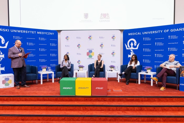 W kolejnej części debaty prelegenci opowiedzieli o swoich pierwszych doświadczeniach związanych z różnorodnością, które zdobyli przed wyjazdem za granicę czy rozpoczęciem nauki w GUMed.