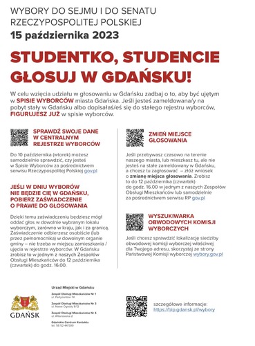 W poniedziałek, 9 października w godz. 9-14 na kampusie GUMed stanie mobilny punkt informacyjny. Przed budynkiem Collegium Biomedicum urzędnicy z Urzędu Miejskiego w Gdańsku odpowiedzą na wszystkie pytania i podpowiedzą, gdzie można oddać swój głos. Będzie to także okazja, by dopisać się do spisu lub umówić na pobranie zaświadczenia o prawie do głosowania.