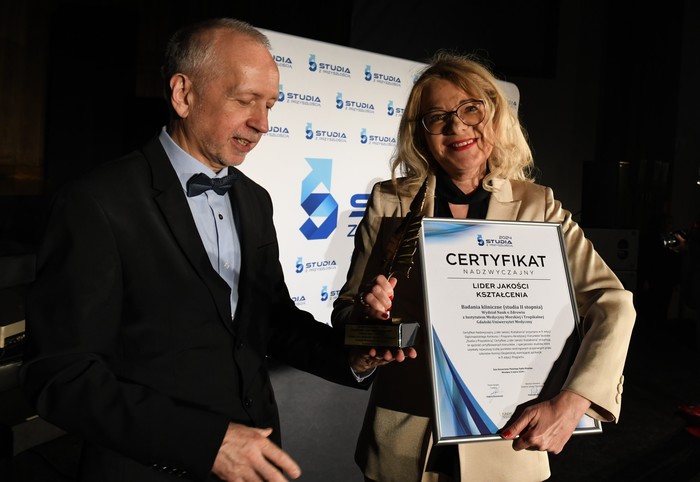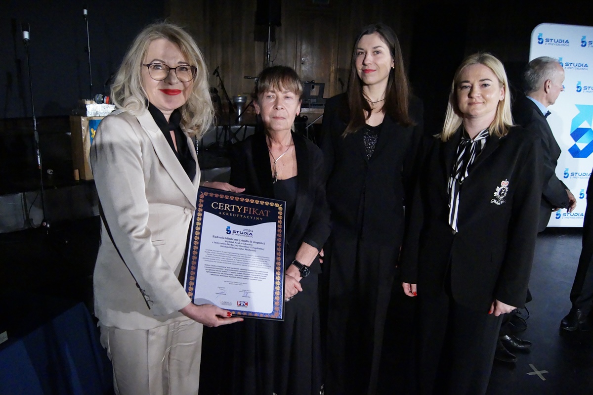 Uruchomiony w roku akademickim 2023/2024 nowy kierunek – badania kliniczne został doceniony nie tylko przez studentów. Fundacja Rozwoju Edukacji i Szkolnictwa Wyższego wyróżniła go akredytacją „Studia z Przyszłością”, która jest przyznawana najbardziej innowacyjnym i wartościowym kierunkom i programom studiów na polskich uczelniach, dostosowanym do potrzeb rynku pracy, jak również cechującym się nowoczesnością rozwiązań dydaktycznych. Finałowa gala ogólnopolskiego Konkursu i Programu Akredytacji Kierunków Studiów „Studia z Przyszłością” odbyła się 4 marca br. we Wrocławiu, a certyfikat dla nagrodzonego kierunku kształcenia w GUMed odebrała prof. Edyta Szurowska, prorektor ds. klinicznych, współautorka programu nauczania na kierunku badania kliniczne. W uroczystości udział wzięły także dr inż. Joanna Bidzińska z II Zakładu Radiologii i dr Marta Bednarek z Działu Niekomercyjnych Badań Klinicznych. Organizatorzy uroczystości wyróżnili również kierunek badania kliniczne certyfikatem nadzwyczajnym „Lidera jakości kształcenia”.
