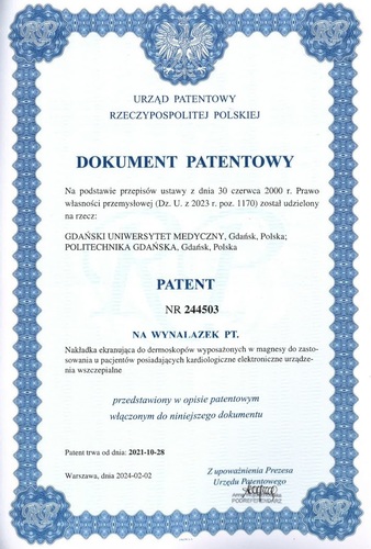 Urząd Patentowy Rzeczypospolitej Polskiej wydał dokument patentowy dla wynalazku pt. Nakładka ekranująca do dermoskopów wyposażonych w magnesy do zastosowania u pacjentów posiadających kardiologiczne elektroniczne urządzenia wszczepialne. Rozwiązanie powstało jako efekt pracy zespołu naukowców z Kliniki Kardiologii i Elektroterapii Serca oraz Katedry i Kliniki Dermatologii, Wenerologii i Alergologii GUMed, a także z Instytutu Nanotechnologii i Inżynierii Materiałowej Wydziału Fizyki Technicznej i Matematyki Stosowanej PG.